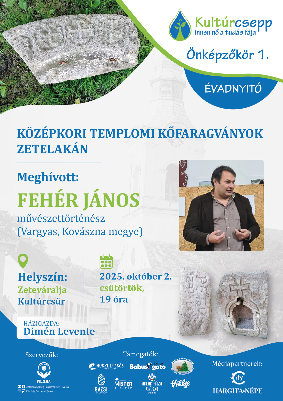 Csütörtökön 19 órától tartják a Kultúrcsepp Önképzőkör évadnyitóját a zeteváraljai Kultúrcsűrben. Az eseményen Fehér János művészettörténész tart előadást Középkori templomi kőfaragványok Zetelakán címmel, a házigazda Dimén Levente lesz. A kulturális sorozatot a Pro Zetea Egyesület és Zetelaka Község Polgármesteri Hivatala indítja útjára. A Hargita megyét érintő és a magyar egyetemes kultúráról szóló előadások, könyvbemutatók minden második héten, csütörtökön 19 órától lesznek, az első évad június 15-ig zajlik.