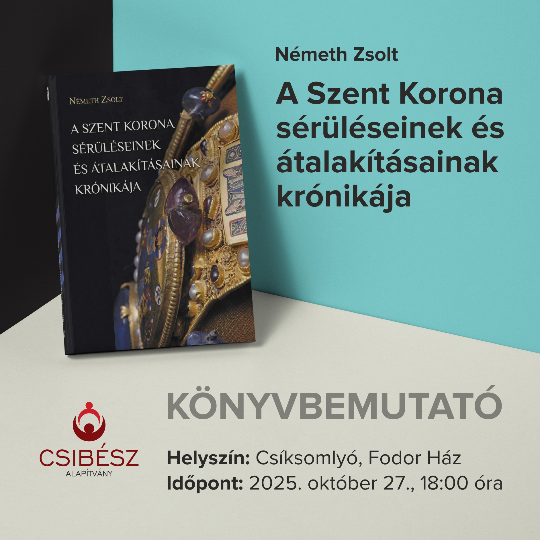 Németh Zsolt A Szent Korona sérüléseinek és átalakításainak krónikája című kötetét mutatják be hétfőn 18 órától Csíksomlyón, a Fodor Házban. A Szent Korona a magyarság legfontosabb nemzeti kincse és a közvagyon első számú értéke, ennek ellenére kevéssé ismert, hogy mennyi sérülés érte és milyen sok átalakításon ment keresztül. A gazdagon illusztrált kötetben 79 kép – köztük több először közzétett archív és modern felvétel –, öt ábra és 11 táblázat segíti a szerző közérthetően megírt és gondosan adatolt elemzéseinek követését. Szervező: Csibész Alapítvány.