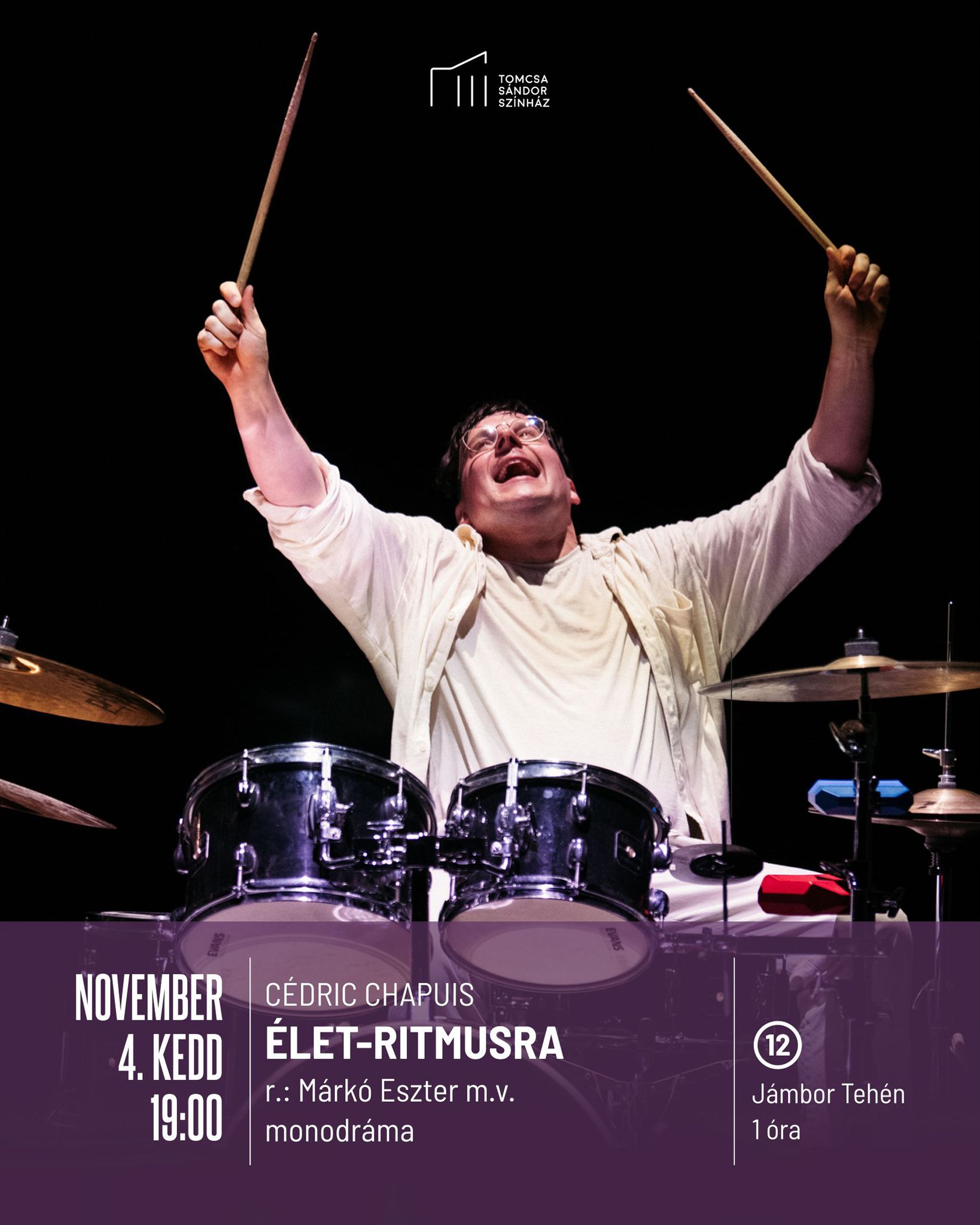 A székelyudvarhelyi Tomcsa Sándor Színház színésze, Esti Norbert Élet-ritmusra (r.: Márkó Eszter) című monodrámája tekinthető meg kedden 19 órától a Jámbor Tehén restropubban. Az előadás leírása szerint Adrien Lepage más, mint a többiek, bukdácsol az iskolában, nincsenek barátai, keveset beszél. Üti a ritmust mindenen, ami a keze ügyébe kerül: a falon, az asztalon, az öccsén, az anyja edényein. A környezete ideges. A nagyi öröksége egy különleges világba varázsolja őt. Aztán megérkezik az életébe Tiketum, a dobszerkó. Adrien osztályelső lesz, egy megtestesült házitündér, zenekart alapít, és elkezd hasonlítani a többiekre. Vagy mégsem? Jegyek válthatók a Tomcsa Sándor Színház jelenlegi jegypénztárában hétköznapokon 11–14 és 15–17 óra között (Kossuth Lajos utca 20. szám) vagy az in-time.hu honlapon.