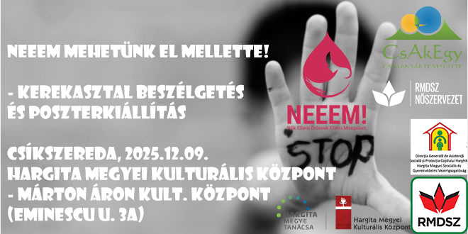 NEEEM mehetünk el mellette! címmel szervez minikonferenciát a Csíki Anyák Egyesülete kedden 16 órától Csíkszeredában, a Hargita Megyei Kulturális Központ könyvtártermében. A kerekasztal-beszélgetésen helyi szakemberek és civil szervezeti képviselők lesznek jelen, bemutatják az egyesület januártól induló támogató csoportját, a témához illeszkedő eredményeket, tényeket, illetve Kovács Anna felügyelő, a Hargita Megyei Szociális és Gyermekvédelmi Vezérigazgatóság közkapcsolatokért felelős munkatársa által készített Mondjunk nemet a családon belüli erőszakra című kisfilmjét a védett otthonokról. A beszélgetés meghívottjai Gál Katalin, a Hargita Megyei Szociális és Gyermekvédelmi Igazgatóság osztályvezetője, Lukács Eszter klinikai pszichológus, a Hallgatlak erdélyi telefonos lelkisegély-szolgálat lelkisegély-vezetője, Lipeczky Erna Andrea támogató csoportvezető, Gábor Zsuzsa tanácsadó tanár, valamint Csiszer Csaba, a Hargita Megyei Szociális és Gyermekvédelmi Vezérigazgatóság Bántalmazott, Elhanyagolt és Kizsákmányolt Gyermekek Sürgősségi Befogadó és Intervenciós Központjának vezetője lesznek, moderál Gergely Orsolya szociológus, egyetemi docens (Sapientia – EMTE). Az eseményen poszterkiállítás is lesz, amelyre névtelenül beküldött történeteket várnak ma 12 óráig, ehhez az űrlap elérhető az esemény közösségi oldalán levő linken. A program a 16 napos figyelemfelkeltő kampány részeként valósul meg, amelyhez több Hargita megyei állami intézet és civil szervezet csatlakozott, célja a nők elleni bántalmazások megelőzése és a lakosság tudatosságának növelése. Főszervező: Csíki Anyák Egyesülete, támogatók: RMDSZ Nőszervezet, Hargita Megyei Kulturális Központ, partner: Hargita Megyei Szociális és Gyermekvédelmi Igazgatóság.