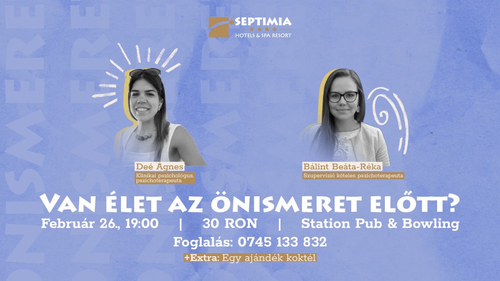 Van élet az önismeret előtt? címmel szerveznek beszélgetést csütörtökön 19 órától Székelyudvarhelyen, a Septimia Station Pub & Bowlingban. Az esemény az önismeret világába kalauzolja az érdeklődőket, Deé Ágnes klinikai pszichológus, pszichoterapeuta és Bálint Beáta-Réka szupervízió-köteles pszichoterapeuta osztják meg gondolataikat arról, hogyan működünk a mindennapokban, és mi változhat, ha jobban megértjük önmagunkat. A belépő ára 30 lej, a helyek száma korlátozott, asztalfoglalás szükséges a 0745–133832-es telefonszámon.
