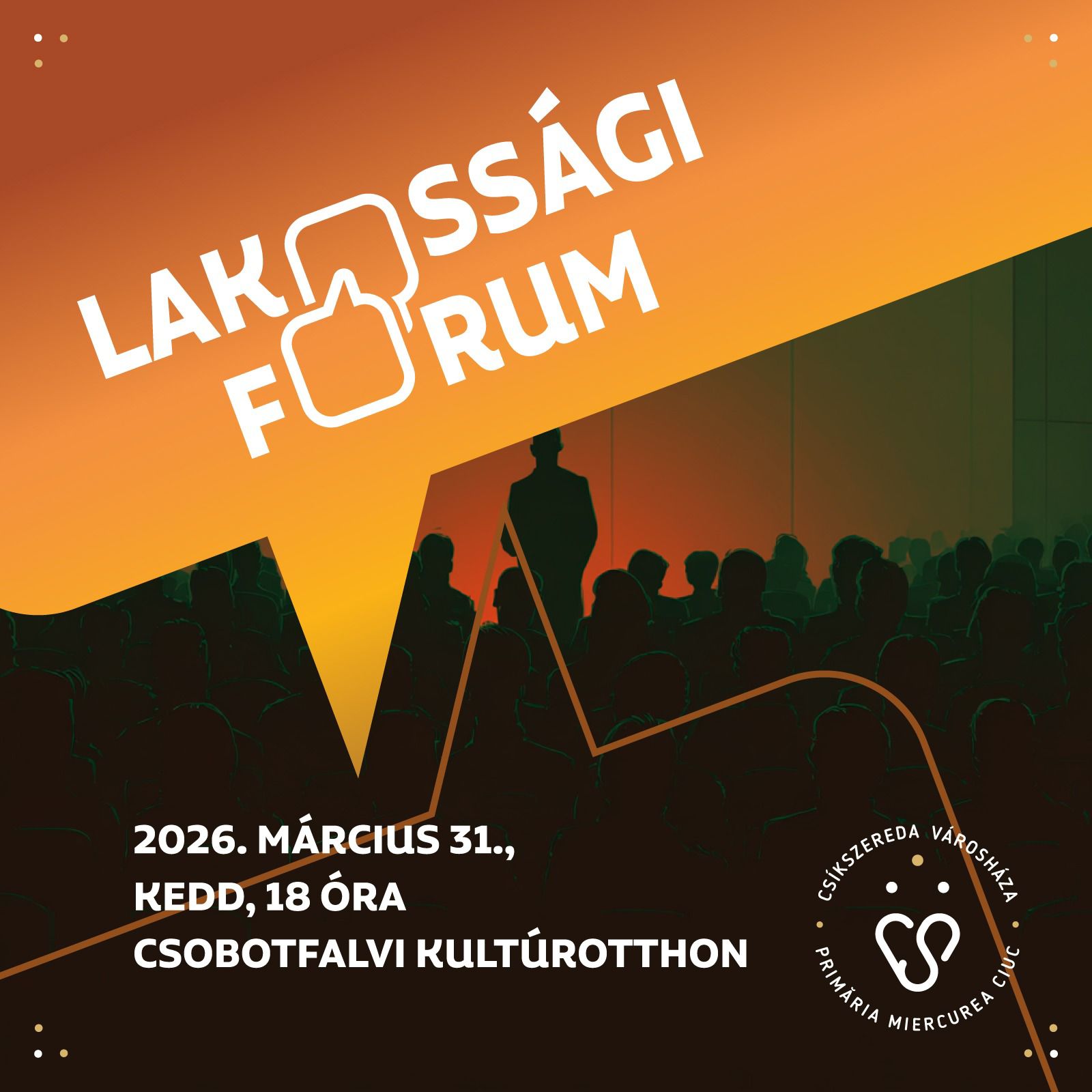 Lakossági fórumot szervez Csíkszereda polgármesteri hivatala kedden 18 órától a csobotfalvi kultúrotthonban. Az eseményen lehetőség nyílik az adott területet érintő kérdések megvitatására, a városvezetés várja a helyi lakosok észrevételeit, kérdéseit és javaslatait. A találkozón szó lesz a városrész aktuális ügyeiről, valamint a következő időszak terveiről is.