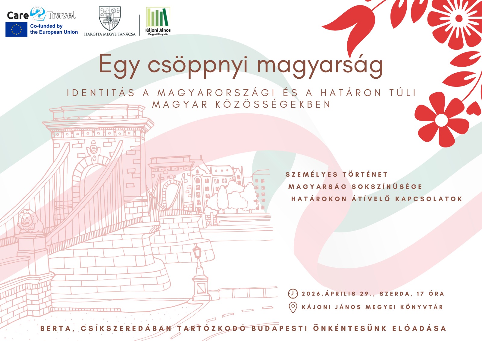 Egy csöppnyi magyarság: identitás a magyarországi és a határon túli magyar közösségekben címmel szervez interkulturális estet a Care2Travel Egyesület és a Kájoni János Megyei Könyvtár szerdán 17 órától a könyvtárban. Az eseményen Berta, Csíkszeredában tartózkodó budapesti önkéntes mutatja be az érdeklődőknek a magyarság sokszínűségét.