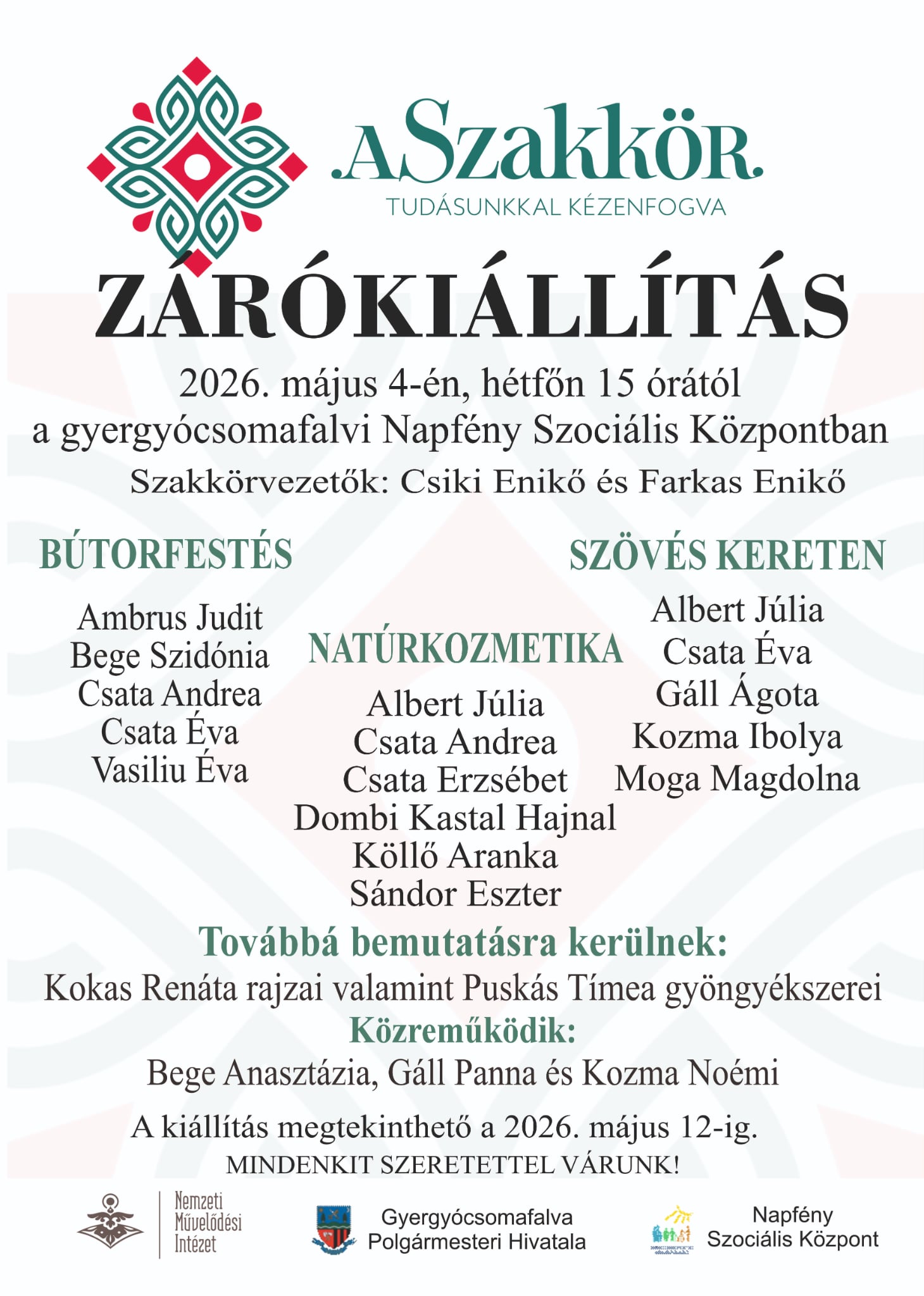 A Szakkör kézműves-tevékenységeket tömörítő zárókiállítását nyitják meg hétfőn 15 órától a gyergyócsomafalvi Napfény Szociális Központban. A Csiki Enikő és Farkas Enikő vezette helyi szakkör kiállítói bútorfestés, natúrkozmetika és szövés témakörben mutatják be alkotásaikat, emellett az érdeklődők megtekinthetik Kokas Renáta rajzait és Puskás Tímea gyöngy ékszereit is.