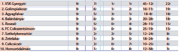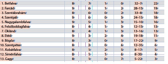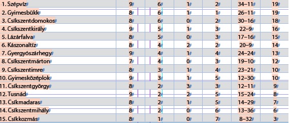 | Két meglepetés A Román Kupában Egy találkozó kivételével a múlt héten játszották a labdarúgó Román Kupa megyei szakaszának második körét. Némi meglepetésre két 4. ligás csapatot is a Csík körzeti bajnokságban szereplő csapat búcsúztatott. Etéden egy tucat, Székelyszentléleken és Parajdon kilenc találat esett, de csak utóbbi helyszínen távoztak boldogan a pályáról a házigazdák. Eredmények: Parajd – Farkaslaka 6–3, Székelyszentlélek – Székelyudvarhelyi Golimpiakosz 0–9, Csíkszentimre – Balánbánya 4–2, Kászonaltíz – Csíkszentsimon 3–5, Zeteváralja – Gyergyószárhegy 2–5, Etéd – Székelykeresztúr 0–12, Oklánd – Homoródalmás 1–3, Csíkszentgyörgy – Csíkcsicsó 3–1, Csíkszentkirály – Csíkszentdomokos 3–0, Malomfalva – Székelyudvarhelyi Roseal 0–2, Betfalva – Agyagfalva 0–5, Szentpál – Farcád 5–1, Nagygalambfalva – Felsőboldogfalva 4–1, Szépvíz – Gyimesbükk 1–4. A Kápolnás – Zetelaki Fenyő meccset kedden 16 órától játsszák. |