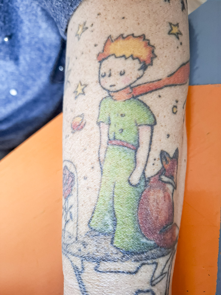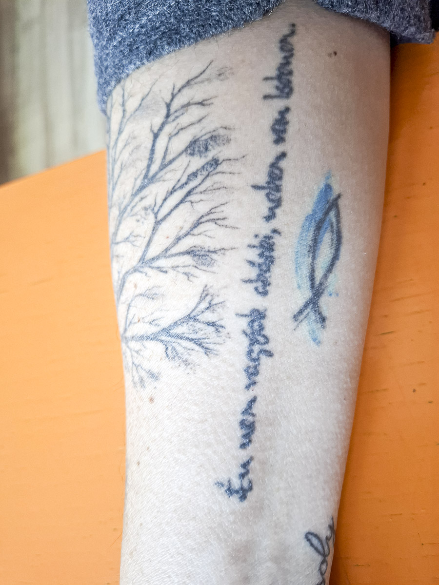„Sokaknak feltűnik, hogy tetoválások vannak rajtam. Az első a húgom halálának egyéves évfordulójára készült. A gyászfolyamat része volt. Hátul, a vállamra kértem, mert úgy éreztem, hogy el kell engednem, mégis valamilyen formában meg szeretném tartani. Ne szembesüljek vele minden tükörbe nézéskor, de tudjam, hogy ott van. Így indult a tetoválás, amely aztán életünnepléssé változott. Azóta minden születésnapomra tetováltatok, az eltelt év nagy élményét, örömét örökítem meg. A második egy felirat: »Én nem vagyok akárki, mert nekem van Istenem.« Egyik évben az volt a fő kérdésem, hogy miért nem mosolyognak az emberek. Így került csuklómra a »mosoly« szó, hogy bár nekem jusson eszembe: erre mosolyogj rá, ennek örvendjél. Aztán lett életfa ötvenéves koromban, hogy emlékezzek a gyökereimre, és van Kis hercegem is.