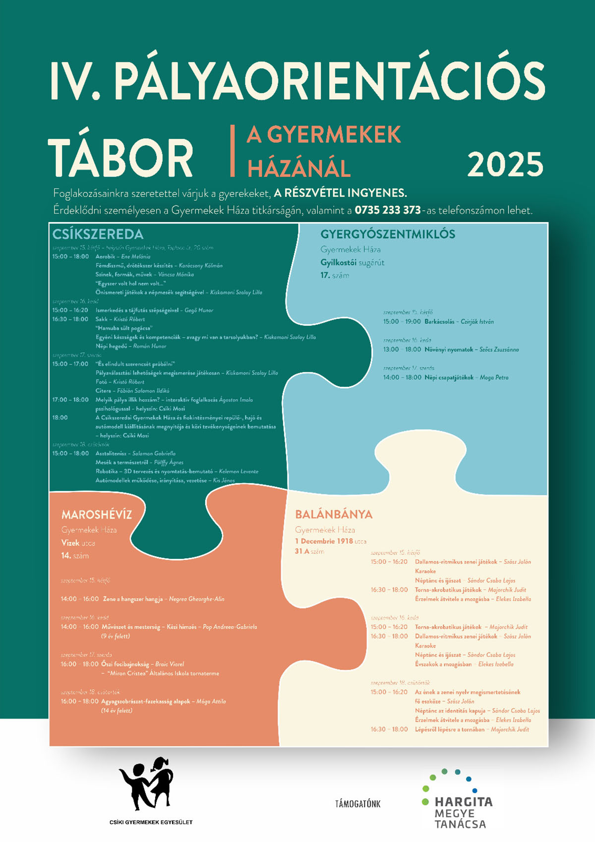 Idén is megszervezi pályaorientációs táborát a Csíkszeredában, Gyergyószentmiklóson, Maroshévízen és Balánbányán működő Gyermekek Háza. Gyergyószentmiklóson máig, a további három helyszínen holnapig zajlik az esemény, amelynek célja bemutatni az iskoláskorú gyermekeknek a különböző, az intézmény által ajánlott hagyományőrző, kreativitást fejlesztő művészeti, valamint technikai és sportköröket. A táborban a gyermekek megtapasztalhatják, mi az, ami jól megy nekik, mi az erősségük, mihez van kedvük, érzékük, esetleg olyan tevékenységeket is megismerhetnek, amelyekre korábban nem volt lehetőségük. A foglalkozásokat az intézmény kirendelt egységeinek székhelyén tartják délutánonként, a részvétel ingyenes, regisztrálni előzetesen a 0735–233373-as telefonszámon vagy a helyszínen lehet.