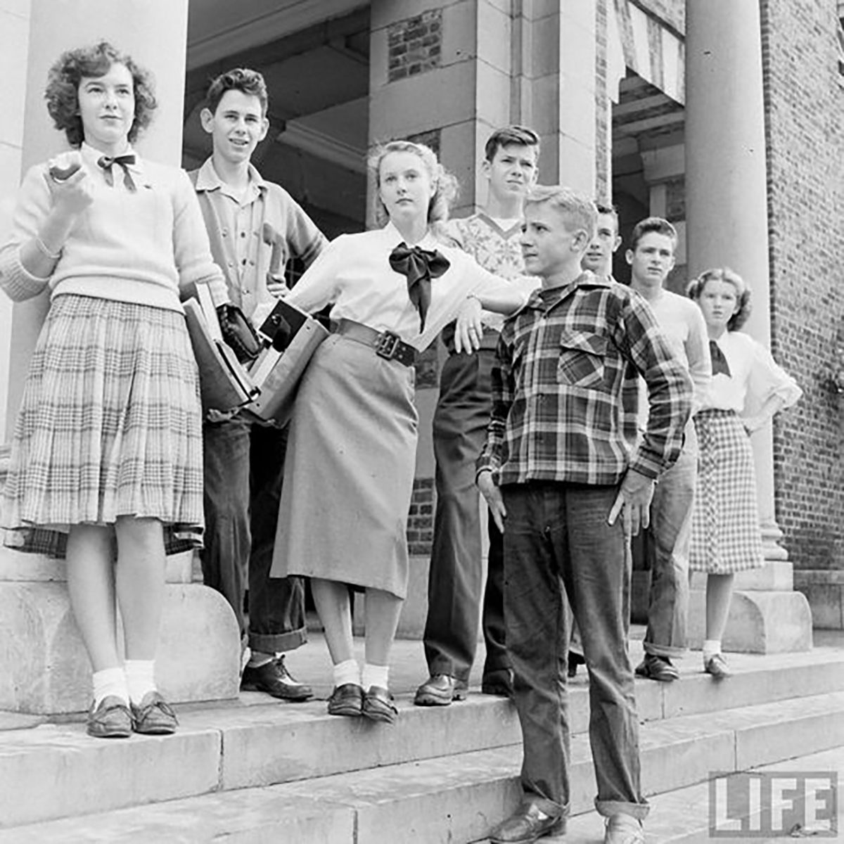 A negyvenes években az egyszerűbb szabású viseleteké volt a főszerep. A váll puffos ujjakkal, válltöméssel való hangsúlyozása, a derékban szűk szabás, majd a térdig érő, lágy esésű szoknyák, illetve a bő szárú nadrágok révén elért A vonalú fazon volt a jellemző. A nyakkivágás rendkívül változatos és fantáziadús volt, lehetett V alakú, kerek, ráncolt vagy keresztezett is. A szoknya-blúz párosítás és a szépen szabott ruha egyformán divatosak voltak.