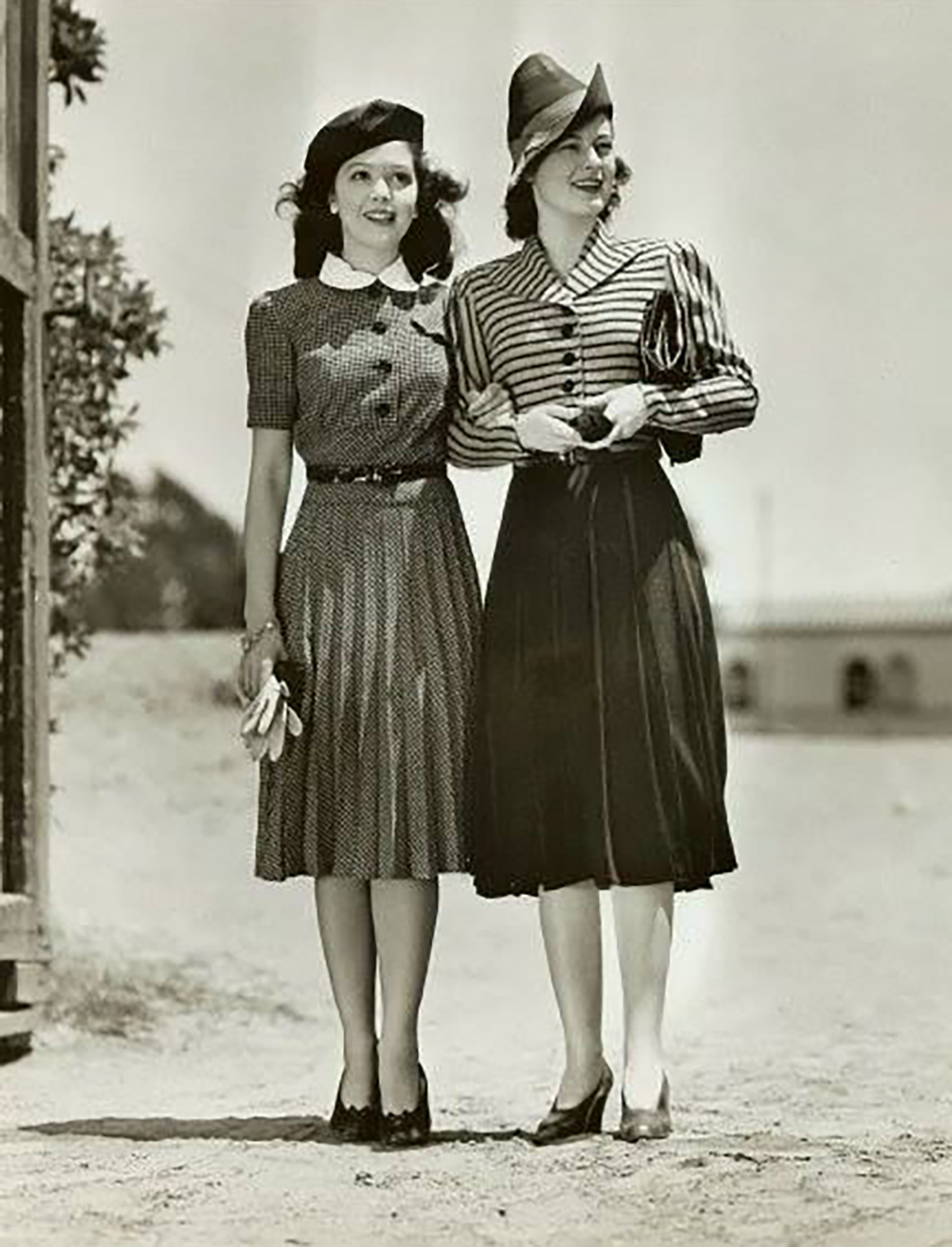 Az 1940-es évek női divatja férfias részletekkel készített homokóra-sziluett megalkotásáról szólt: a magas derekú dolgokról és a térdre hulló, A vonalú szoknyáról. Az öltönyöktől a ruhákig ez jellemezte a hétköznapi viseletet, de még a nadrág is hasonló, magas derekú és széles aljú volt.