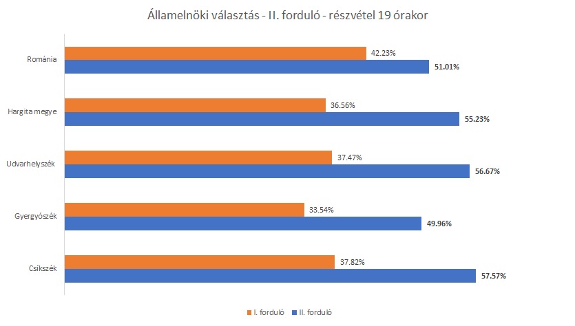 Országosan a részvételi arány 19 órakor a második fordulóban 51,01 százalék, míg az első fordulóban 42,23 százalék volt.