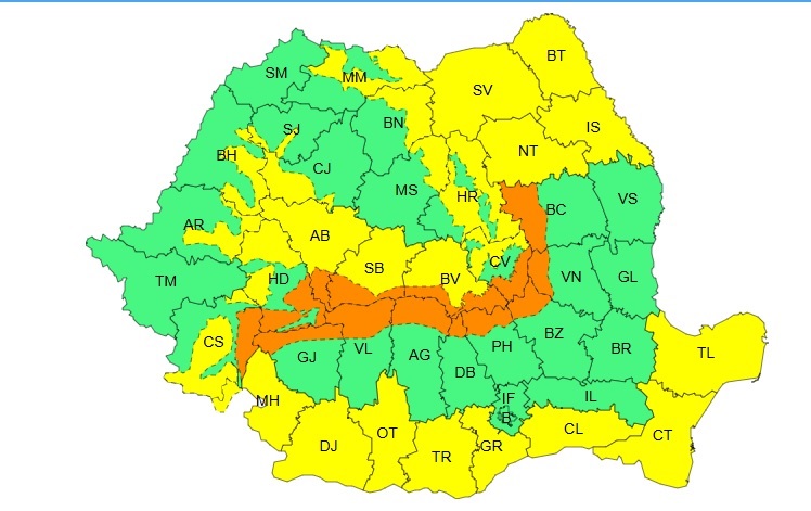 Az előrejelzés szerint Arad, Argeş, Bákó, Beszterce-Naszód, Bihar, Botoşani, Brassó, Buzău, Călăraşi, Dâmboviţa, Dolj, Fehér, Giurgiu, Gorj, Hargita,Hunyad, Iaşi, Kolozs, Konstanca, Kovászna, Krassó-Szörény, Maros, Máramaros, Mehedinţi, Neamţ, Olt, Prahova, Suceava, Szeben, Szilágy, Teleorman, Tulcea, Vâlcea és Vrancea megye áll riasztás alatt kedden.