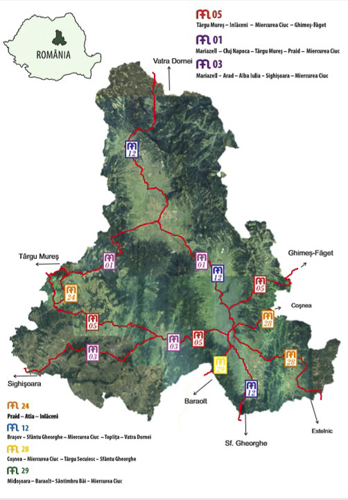 Megyénkben a főútvonal mellett – amely közel 100 km-es szakasz Sóvárad, Énlaka, Oroszhegy és Csíksomlyó között – több regionális, alternatív zarándokút is található, amelyek összeköttetésben vannak a Maros és Kovászna megyei úthálózatokkal is. Önkéntesek segítségével kiépítették és karbantartják a Gyimesbükk, Apahavas, Ugrapataka, Széphavas, Szépvíz, Borzsova, Delne, Pálfalva és Csíksomlyó közötti útvonalat; valamint a Sóvárad, Parajd, Bucsin-tető és Csíksomlyó közötti szakaszt is. Ugyanakkor Segesvárról, Tusnádfürdőről, Bélborról, Kászonaltízről és a Csíkszentimrei Büdösfürdő felől is el lehet jutni a Mária-út egy-egy kiegészítő útvonalán Somlyóra.
