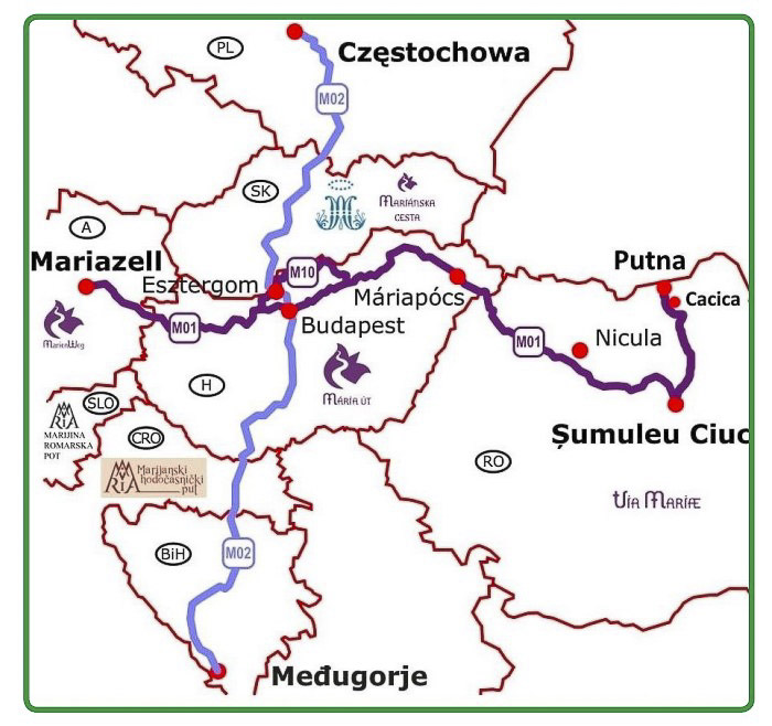 Forgalmas utaktól távol, néma tájakon gyalogolnak a Mária-út zarándokai, időnként kisebb-nagyobb településeket érintve, ahol megszállhatnak. A zarándokút összekapcsolja a közép-európai Mária-kegyhelyeket: kelet–nyugat irányban Mariazell, Budapest, Máriapócs és Csíksomlyó között, észak–dél irányban Czestochowa, Esztergom, Budapest és Medjugorje között. A két útvonal így egy nagy keresztet rajzol ki Közép-Európa térképén, ökumenikus szemléletű zarándokút-hálózatot alakítva ki Ausztria, Magyarország, Románia, Szlovákia, Lengyelország, Horvátország és Bosznia területén. A Mariazell–Csíksomlyó főszakasz 1400 km hosszú, és mintegy 60 nap alatt lehet megtenni. A teljes út Hernádi Béla zarándok szerint „istentelenül hosszú és embertelenül nehéz”, a zarándokot nemcsak fizikailag, hanem szellemileg és lelkileg is próbára teszi. Az utat bejárók többsége is az utóbbi próbatételről számol be.