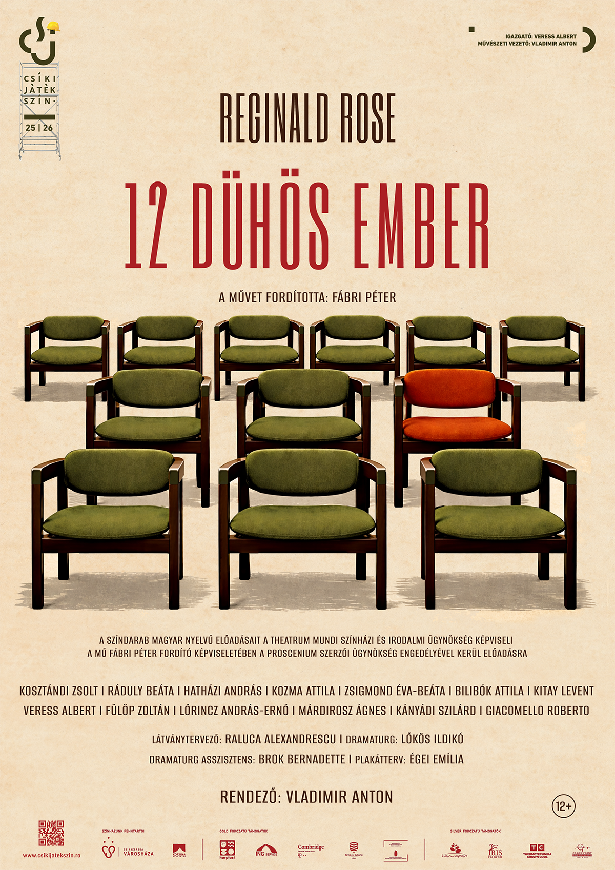 A 12 dühös ember Reginald Rose 1954-ben írt teledrámája, amelyet a Sidney Lumet-féle 1957-es filmváltozat emelt világhírűvé. A darabot a Csíki Játékszín társulata Vladimir Anton rendezésében mutatta be nemrég Csíkszeredában.