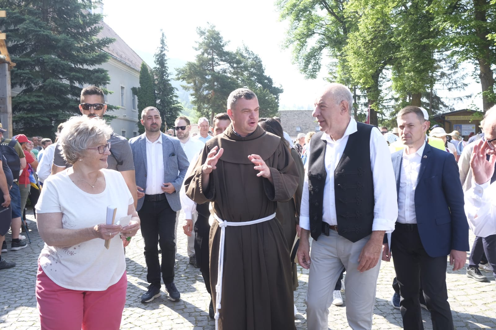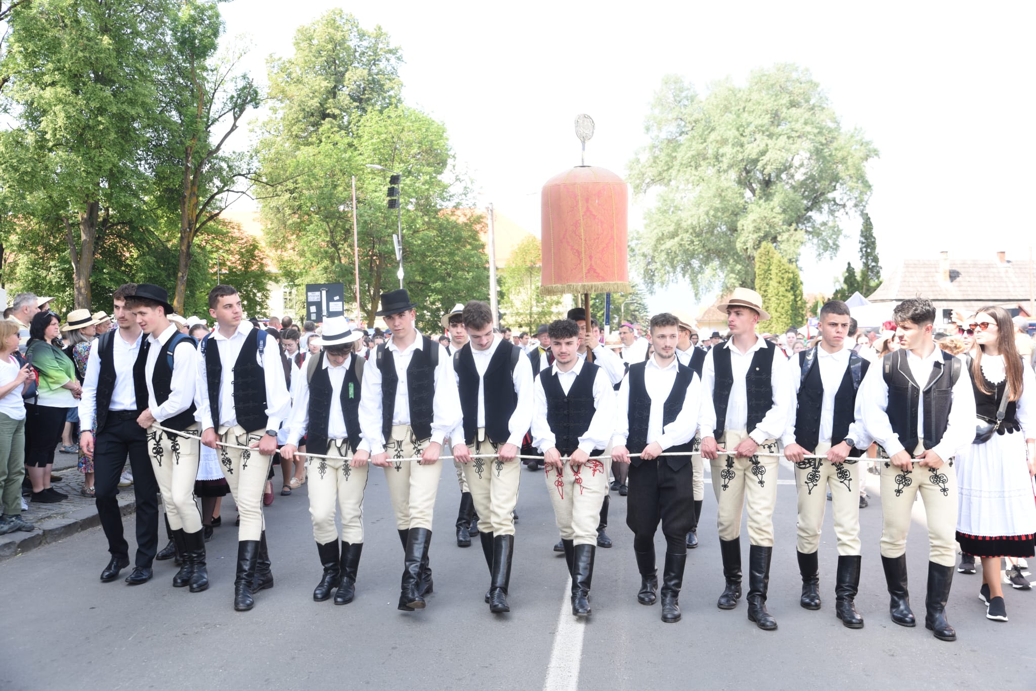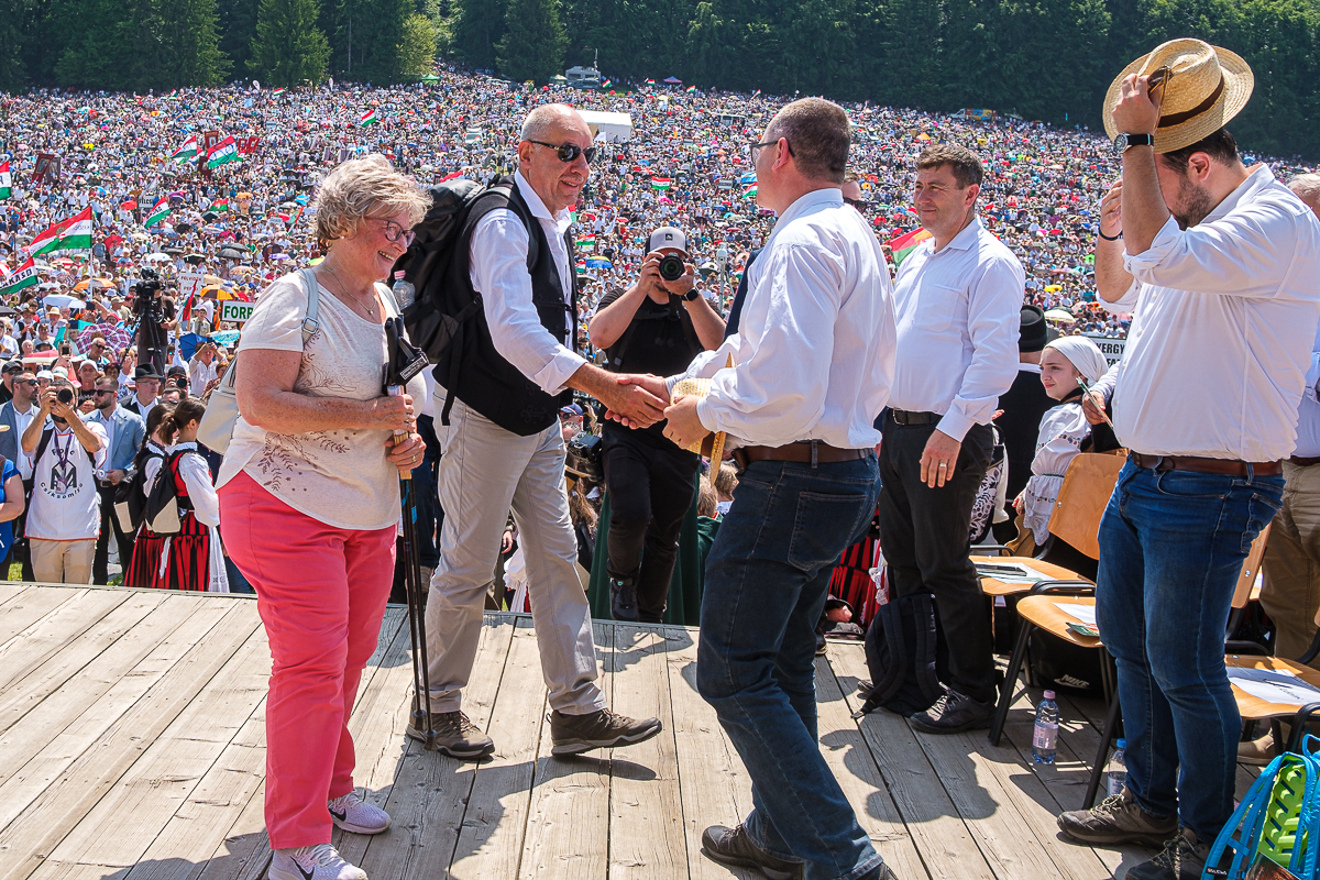 A kordon mögött vonul a búcsú helyszínére mások mellett Sulyok Tamás, Magyarország köztársasági elnöke, Kelemen Hunor, az RMDSZ elnöke, Borboly Csaba, Hargita Megye Tanácsának alelnöke és Vincze Loránt EP-képviselő.