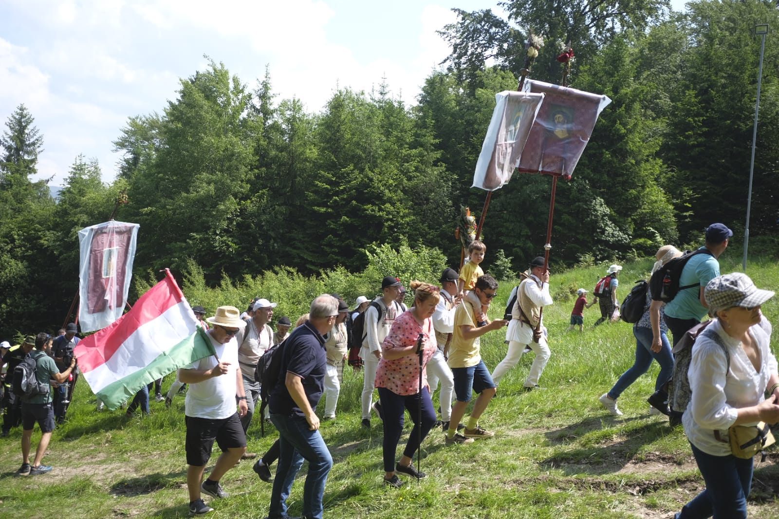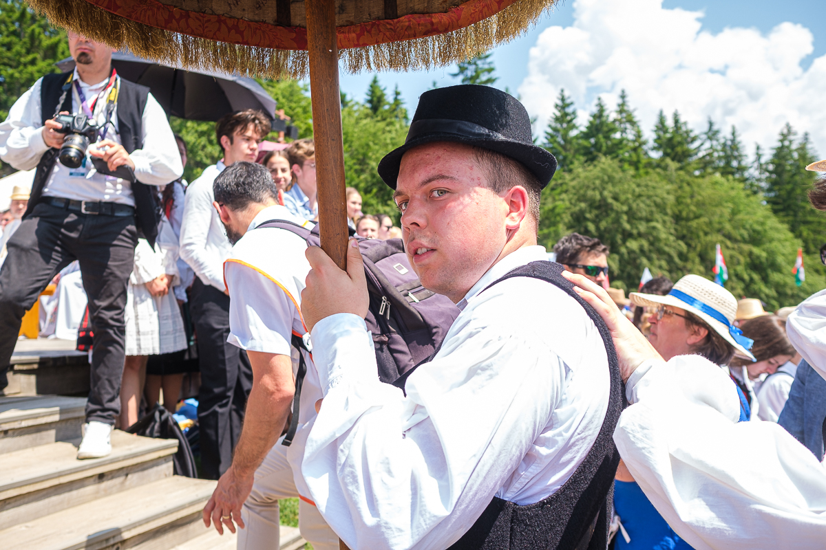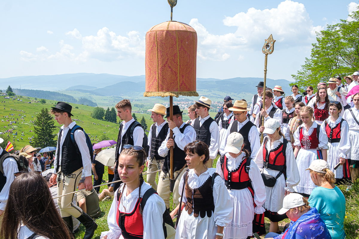 A búcsús körmenet, azaz a Segítő Mária Római Katolikus Gimnázium diákjai alkotta díszkordon 10 óra 30 perckor indult a kegytemplom előtti térről a Hármashalom-oltárhoz. A labarumot, vagyis a győzedelmi zászlót a nyereg felé a csíkszeredai Segítő Mária Római Katolikus Gimnázium diákjai vitték: Koncz Tamás a XII. A osztályból és Gábor Tamás a XII. C osztályból. Segítőjük, vagyis az úgynevezett faciger Újvári Ákos a XII. B osztályból. A pápai kisbazilika jelvényét Becze Gellért XII. A osztályos tanuló vitte. A megtiszteltetés tanulmányi és hiterkölcsi érdemeikért érte a diákokat.