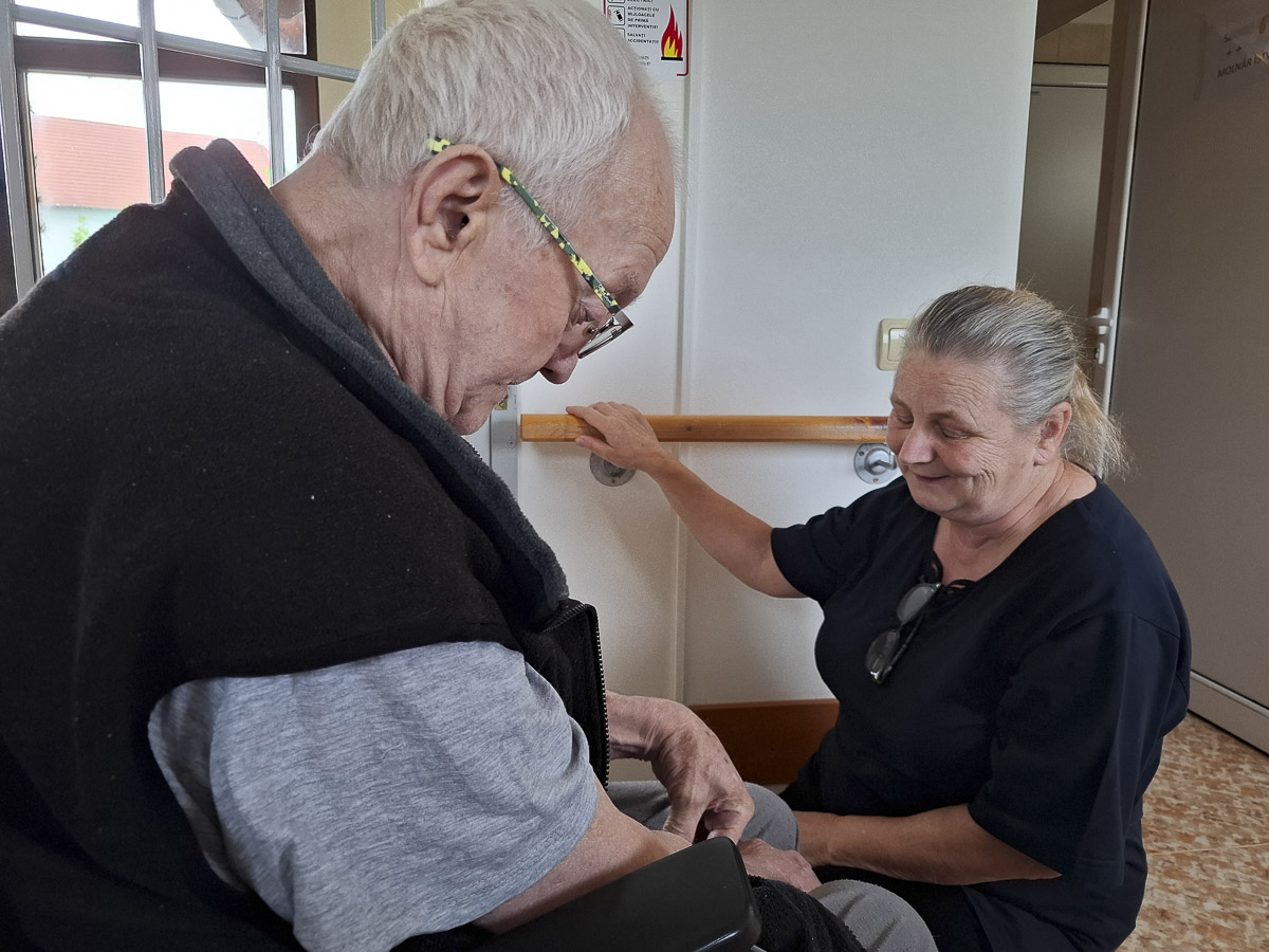 – Ami az itt dolgozókat illeti: ebben az otthonban tiltott a civakodás, a bántás. Én betiltanám a negatív gondolatokat is. Mondanám, a családi bajokat hagyják otthon, de egy asszony ezt nem tudja megtenni, ezért reggel, amikor bejönnek, leülnek, és akkor teszik le az otthoni problémákat. Kapcsolódnak egymáshoz, megbeszélik egymás között, azt az idős ellátott nem kell tudja. A beosztott itt jól kell érezze magát, mert az ő kisugárzását átveszik az idősek, és lehet, hogy zsémbes lesz mindenki. Látom: ha a munkatársaknak lóg az orruk, az öregek idegesek. Szabály az is, hogy itt az idős nem gondozott, hanem egy személy, aki közel áll hozzám. Sajnos emiatt nagyon megviselnek minket a halálesetek, ha valakit elveszítünk, mindig sérülünk. Mondom ezt magamra is, mert bár vezető lettem, továbbra is egy vagyok az ápolók közül – jelzi a Gondviselés házának gondozásvezetője. Arra biztatja munkatársait, hogy leljék meg munkájukban az örömet, keressék cselekedetük és a történések közötti összefüggéseket, abból töltekezzenek. Az éppen szolgálatos két ápoló bizonyítja is: így érdemes. Kovács Erzsébet, akit mindenki Bogárnak szólít, elmondja: