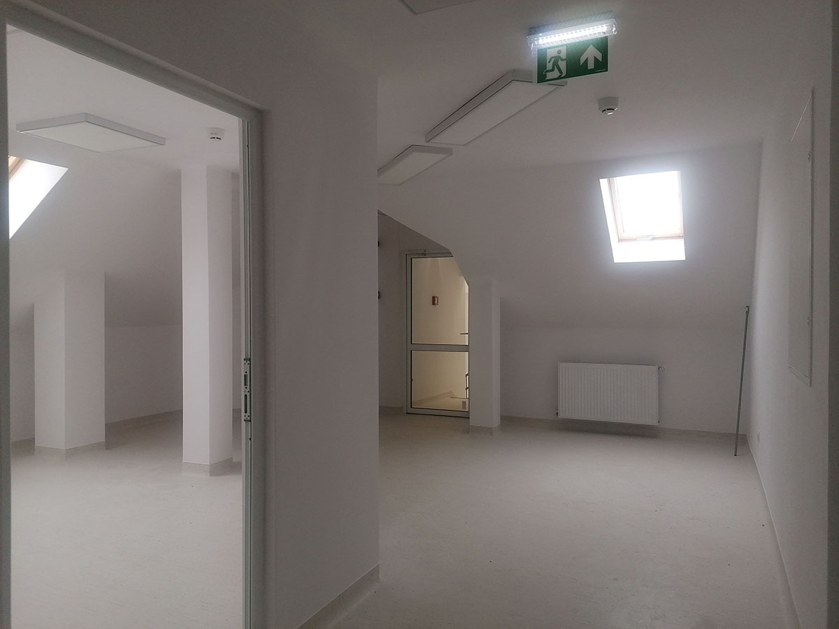 Fülöp Enikő kérésünkre végigvezetett a tetőtérben. Az épületrész feljárata kívülről nyílik, de a poliklinika folyosóiról is meg lehet közelíteni: a lépcsőházból felérve a tetőtérbe, több kisebb, elkészített helyiség fogad, amelyek mindegyike üresen áll.