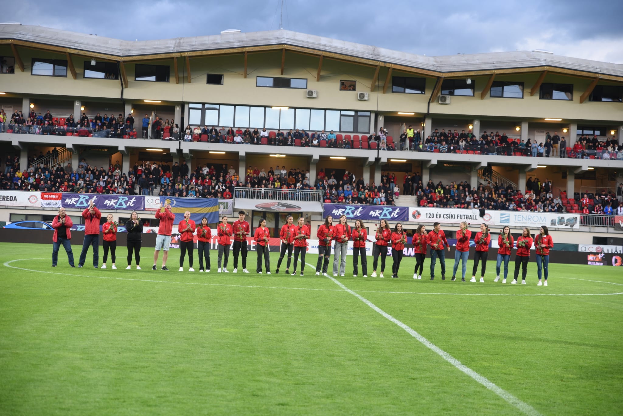 Köszöntötték a pályán az FK Csíkszereda női labdarúgócsapatát, akik a 3. helyen zárták a bajnokságot. Kollégánk tájékoztatása szerint egyébként abszolút telt ház van, több mint 2300 néző és mintegy 50 újságíró van a helyszínen.