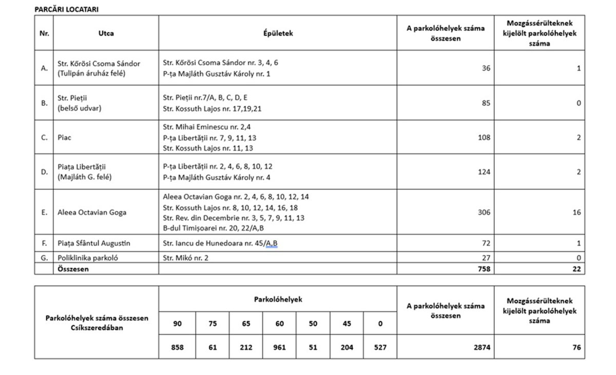 A Csíki Trans Kft. alkalmazásában hat parkolóőr fog felügyelni és három pénztáros fogja a klienseket kiszolgálni két ablaknál – a városi buszállomás, valamint a Mihail Sadoveanu utca 4. szám alatt található ügyfélközpontban –, ahol a jegyek, bérletek is beszerezhetők lesznek. Az alkalmazottaknak egyenruhájuk lesz, amelyet most terveznek. Összesen 2874 parkolóhely és 76 mozgássérülteknek kijelölt parkoló lesz a megyeszékhelyen. Ebből a 0-s zónára esik 1532 parkolóhely plusz 52 mozgássérülteknek, az 1-es zónába pedig 1342 plusz 24 mozgássérülteknek. A lakossági zónában 758 parkolóhely, valamint 22 mozgássérülteknek kijelölt parkolóhely lesz. Ezek listáját honlapunkon (www.hargitanepe.ro) is megtekinthetik. Az igazgató megemlítette, hogy az elektromos autók 50 százalékos kedvezményt kapnak a bérletekre, kivéve a lakossági bérletet. Mindemellett többféle kedvezményre van lehetőség a törvényi előírásoknak megfelelően, ezért ajánlatos tanulmányozni a parkolási szabályzót a szereda.ro honlapon. A tájékoztató táblák felszerelését a hét elején elkezdték, és hamarosan mindenütt kihelyezésre kerülnek.