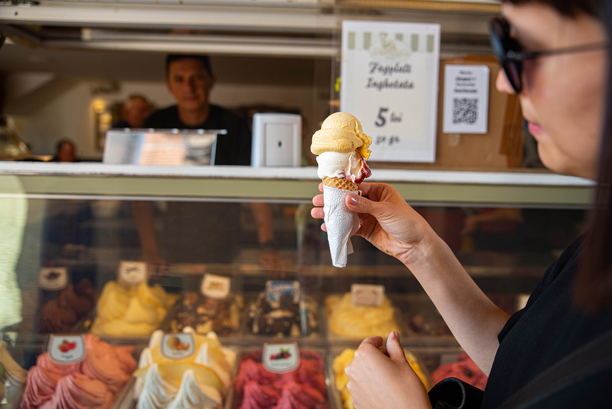 Csíkszeredában viszonylag sok helyen találhatunk helyi, „kézműves” fagylaltot. Az egyik fagyizónál az olasz fagylaltozás-életérzéshez igyekeznek minél közelebb vinni a vásárlót, például spatulával adagolják a terméket. Lengyel László Levente cukrászmester azt mondja: kínálatuk helyben, kizárólag fagyikészítésre használt laborban, kézzel és olasz gépek segítségével készül. Két típust különböztetnek meg: ez a tejalapú gelato és a gyümölcsalapú sorbet. Pultjuk 12 rekeszes, de összesen közel húsz különböző ízű fagyit készítenek, tesztelnek folyamatosan. Egy részük glutén- és laktózmentes, illetve „mindenmentes” is van, amely cukor helyett sztíviát tartalmaz, mesterséges színezékeket pedig egyáltalán nem használnak. A 60 grammos adag ára nyolc lej, mivel nem gombóc formában szolgálják fel, átadás előtt mérlegre helyezik a tölcsért és tartalmát: legfeljebb 15 grammal több lehet, de kevesebb soha.