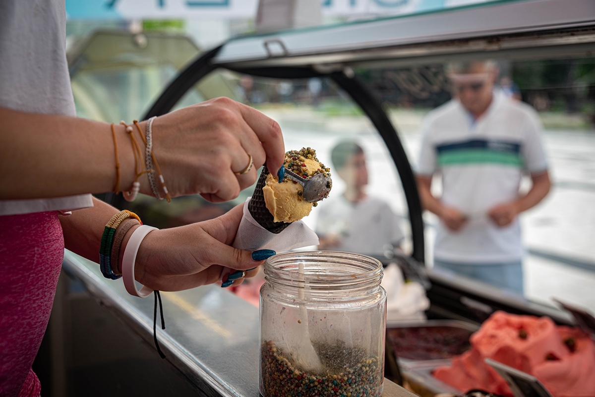 Néhány száz méterre Csíkszeredában készült kézműves fagylaltot találunk 12 ízesítésben, melyek között laktóz- és cukormentesek is vannak. Az üzletvezető elmondta: a 40 grammos gombóc ára 6 lej, idén újdonság a maracuja íz, és legtöbben sóskaramellát és pisztáciát vásárolnak.