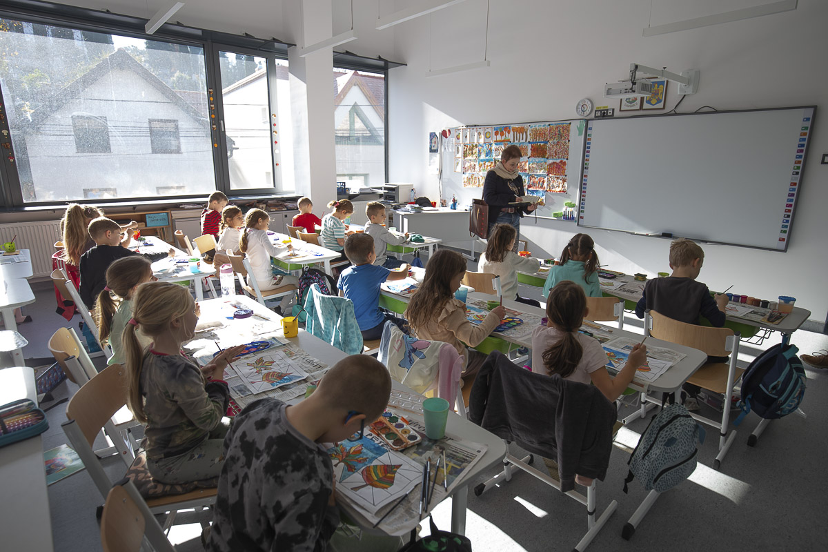 Tágas, világos terek, irigylésre méltó panoráma, nyugtató színek, funkcionális burkolatok – ezek voltak az első benyomásaink az épületben. A tornaterem akár egy sportcsarnok: öltözővel, zuhanyzóval, a folyosók a nálunk megszokotthoz képest szélesek és napfényesek, mert mindenütt hatalmas ablakok, üvegfelületek teszik levegőssé a teret. Épp ezért meglepődtünk, amikor beléptünk egy osztályterembe, mert az már kissé szűkösnek tűnt. Ezt megerősítette Sipos István is, mint mondta, 25-26 gyermeknek még viszonylag komfortosak, de ahová még be kellett szorítani egy padot, ott már nem annyira. Szikszai Réka tanítónő is így vélekedett, de összességében mégis elégedett az új helyszínnel. Tanítványai kórusban mondták, hogy minden nagyon tetszik, volt, aki a focipályát, és volt, aki az osztálytermet tartotta a „legvagányabb” dolognak az épületben.