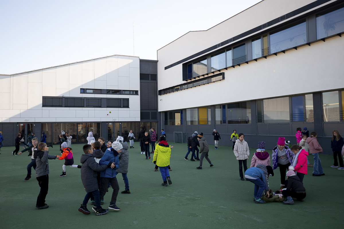 Az épülethez tartozik egy nagy méretű, műfűvel borított sportpálya, a nagyobbak itt töltik a szüneteket. Tulajdonképpen rendben van minden, bár – mint az igazgató és az egyik tanítónő is megjegyezte – ha a tervezés, kivitelezés közben konzultáltak volna velük, talán még funkcionálisabbá lehetett volna tenni.