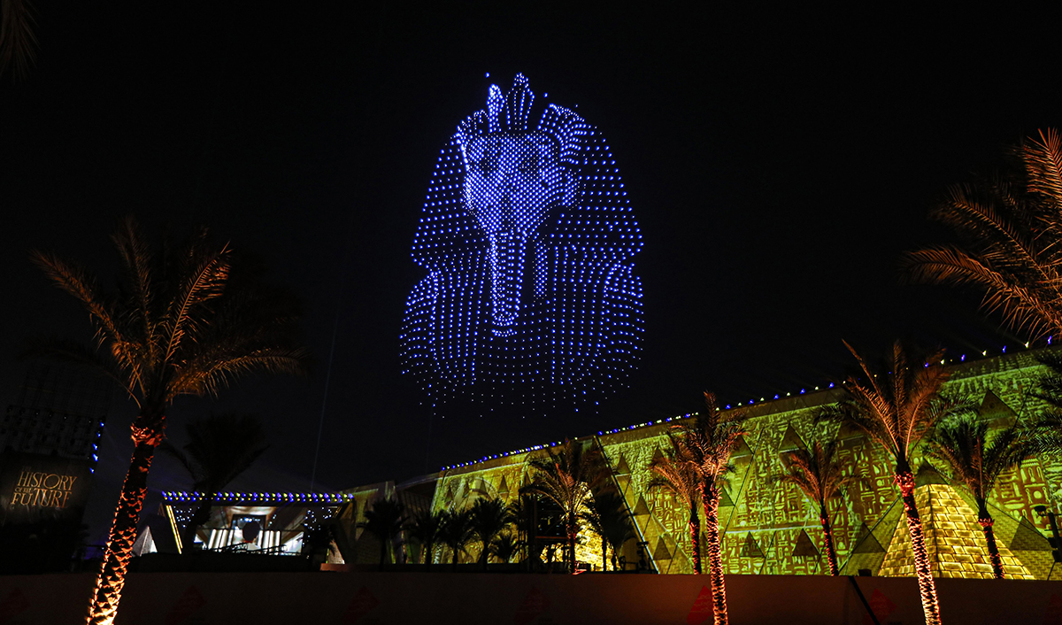 Drón- és fényjáték a Nagy Egyiptomi Múzeum (GEM) megnyitóján Gízában, 2025. november 1-jén. Húsz év építkezés után Egyiptom szombaton avatta fel a Nagy Egyiptomi Múzeumot – a világ legnagyobb múzeumát, amely teljes egészében az ország ókori örökségét mutatja be.