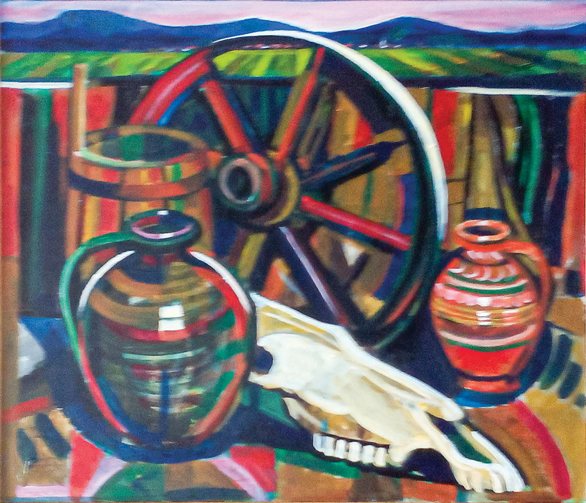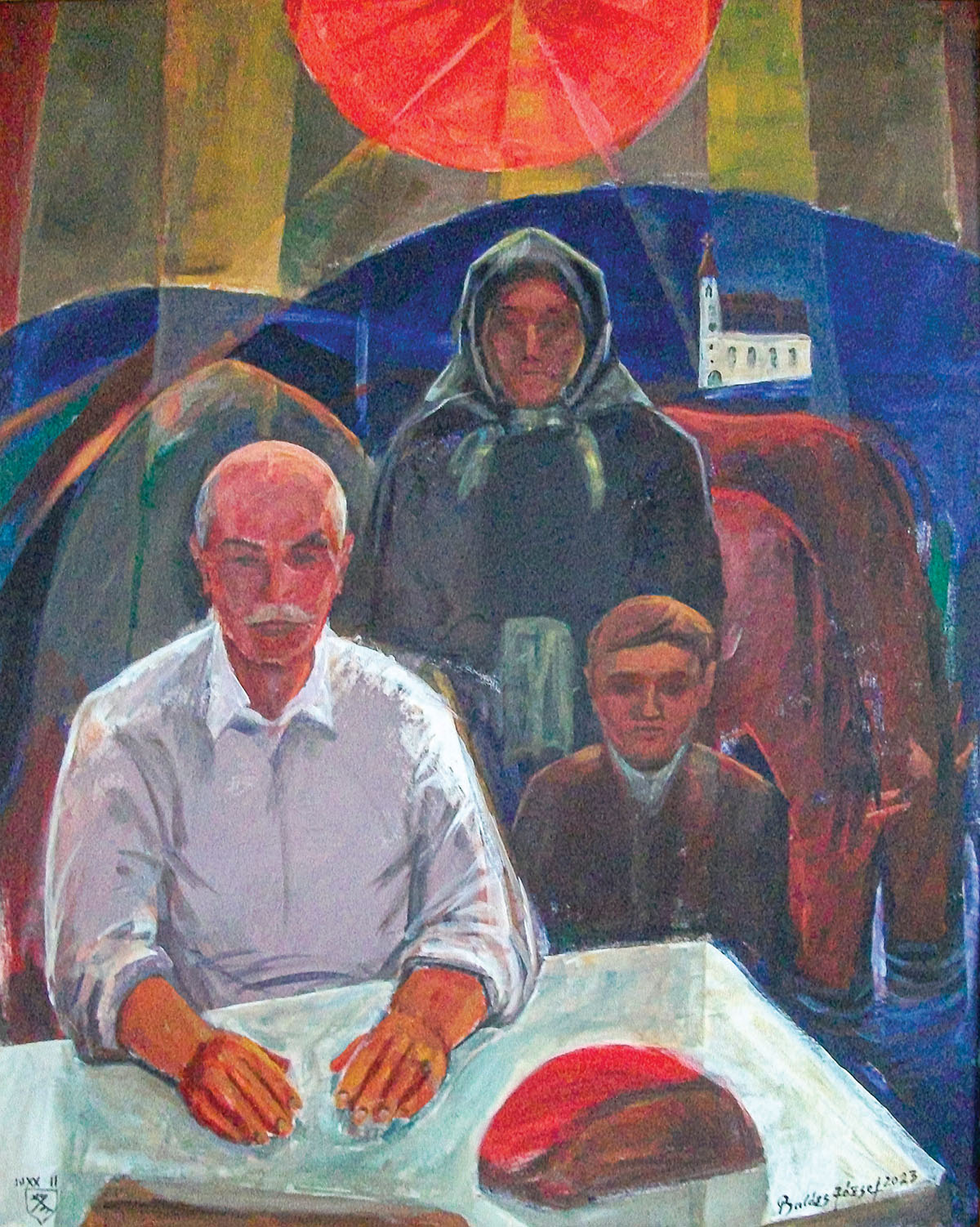 – Az a helyzet, hogy az elvont kompozíció nagy szabadságot ad. Elvont kompozíciót élvezet festeni. Mindenre van lehetőség. Nem kell tartsd magad a perspektíva törvényeihez, nem számítanak az arányok, az arányokat gyermeki módon tudod változtatni. Ami fontosabb, azt felnagyítod, ami kevésbé fontos, azt elhagyod. Annyit festesz meg a mondanivalóból, amennyi pontosan elég ahhoz, hogy megértesse magát. De sohasem tudtam olyan absztrakt képet festeni, hogy a képet magyarázni kelljen. Én a kompozícióba mindig beszúrok valami konkrétumot, mert nem a címmel próbálom rávezetni a nézőt arra, hogy mit akarok mondani, hanem úgy festem meg, hogy a kép árulja el, hogy miről akar beszélni az a festmény. Egyszer valahol olvastam, hogy az agy milyen érdekesen működik, azaz nem a szem, hanem az agy lát. Például egy embert felismersz 30 év távlatából is, bár az az arc már teljesen más, ám abban vannak részletek, amik a régiek. Egy tekintet, vagy mit tudom én, egy valamilyen forma, és arról az agy visszaépíti a régi arcot. Akkor azt mondtam, hogy az absztrakt képbe is csak annyit kell betenni, amiből aztán az emberi agy kiépíti az egészet. Önarcképem is van ilyen, amelyikben csak úgy a fél arcom van benne, egy-egy jellemző karakterjegy, ami az enyém stb., avagy egy csűrnek, egy tájképnek a részlete, és ezekből raktam össze. Talán a címerekkel való foglalkozás hatása ez. Mikor kezdtem tanulmányozni a címereket, akkor láttam, hogy mennyi üzenet van bennük.