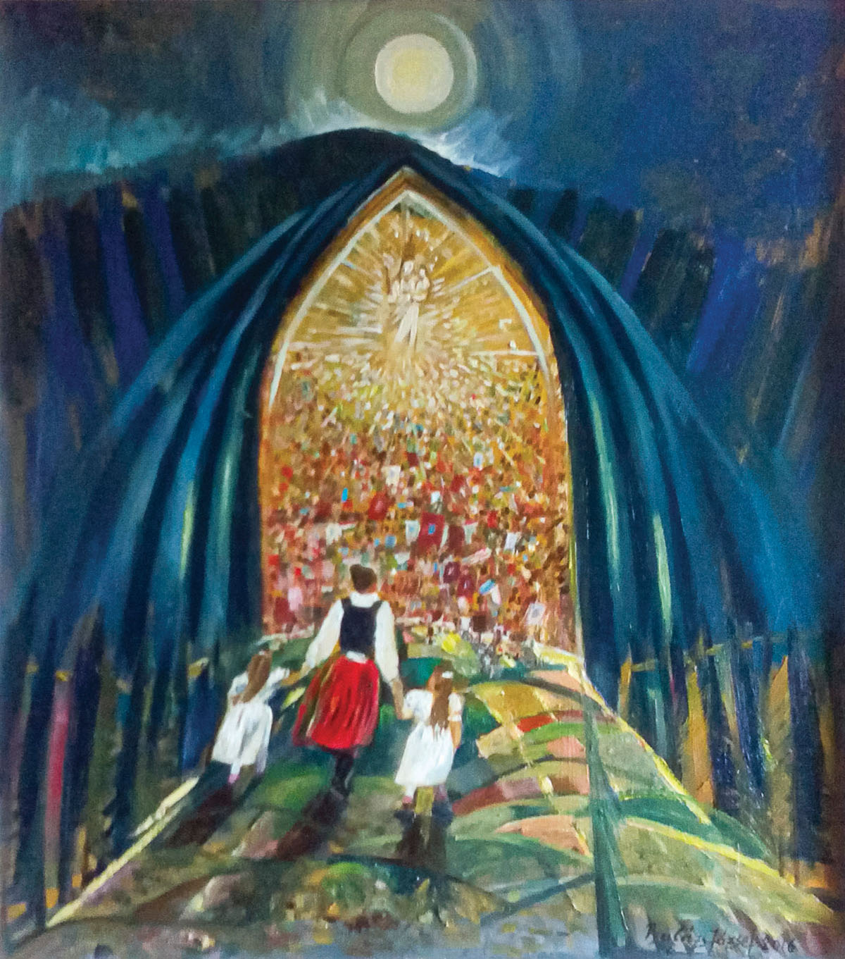 Egy dolog ellenben minden más mai festőtől megkülönbözteti. Ez a Mária-imádat. Hogy mi minden szorul ebbe az egy szóba, arra nehéz választ adni. Pedig számos festménye meg is fogalmazza a kimondhatatlant. A minden pünkösdi zarándoklatai, amelyek alkalmával évről évre közel kétszázan társulnak az általa vezetett csoporthoz, a vezérkereszthez, olyan delejjel bírnak, amiről valóban csak képpel, a szerinte is ezer szót pótló képpel lehet válaszolni. Számára ez a téma kimeríthetetlen.