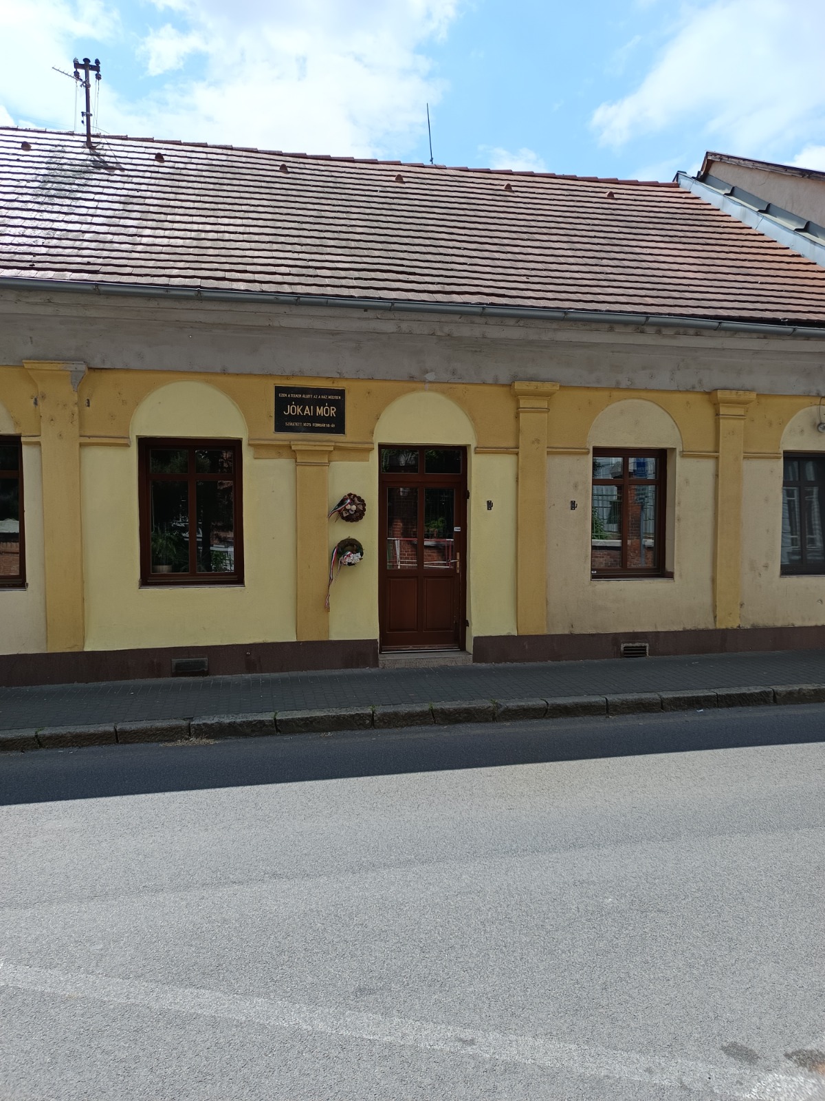 Szabó Csekei Tímea művészettörténész mutatta be a népes csapatnak a Jókai-emlékhelyeket. Elzarándokoltunk a szülői házhoz, ahol a kis Móric született. Azóta már nem áll az épület, de az új ház falán is ott virít az emléktábla, amelyre mindig koszorút helyeznek. Megtudtuk, hogy az írófejedelem a nevét gróf Benyovszky Móric iránti tiszteletből kapta, a rövidebb Mór nevet egy barátja akasztotta rá.