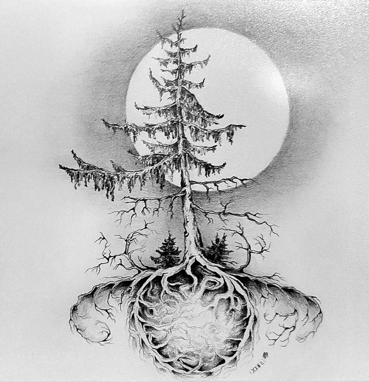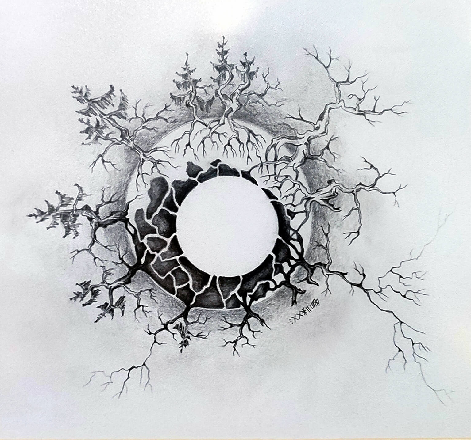 Több mint 12 éve ez volt az első tárlata. Nem a tőle megszokott őselemek, a föld és tűz találkozásának eredményeit vehettük számba, hanem „csak” egyszerűen a papír és ceruza találkozásából született formák forgatagában, örvényében, kuszaságában mélyedhettünk el. A rajzok többségén, egy, két vagy három körszerű objektummal találkozhattunk, amelyek esetenként a Napra, a Földre és a Holdra utalnak. Tulajdonképpen ezeknek a mikrovilágra gyakorolt együttes, vagy egyenkénti hatását, hatásait láthattuk, követhettük, figyelhettük meg a rajzokon. A B5-ös vagy B10-es ceruzával megjelenített formavilágból kitűnik az, hogy sejtszinten, a hajszálgyökerek, gyökerek szintjén már ugyanolyan feszültségek léteznek, hatnak, mint az általunk is ismert és megszokott makrovilágban. Ezt pedig nem más, mint az élet állandó újjászületését, körforgását alakító erők gerjesztették, okozták, indukálták. A gyökerek, indák kuszaságában – főleg a 2022-ben készült rajzokon –, ha nagyon sematikusan, éppen csak jelzésként emberi testrészekre, azok formáira utaló, sejtető alakzatokkal is találkozhattunk, igaz, jól elrejtve.