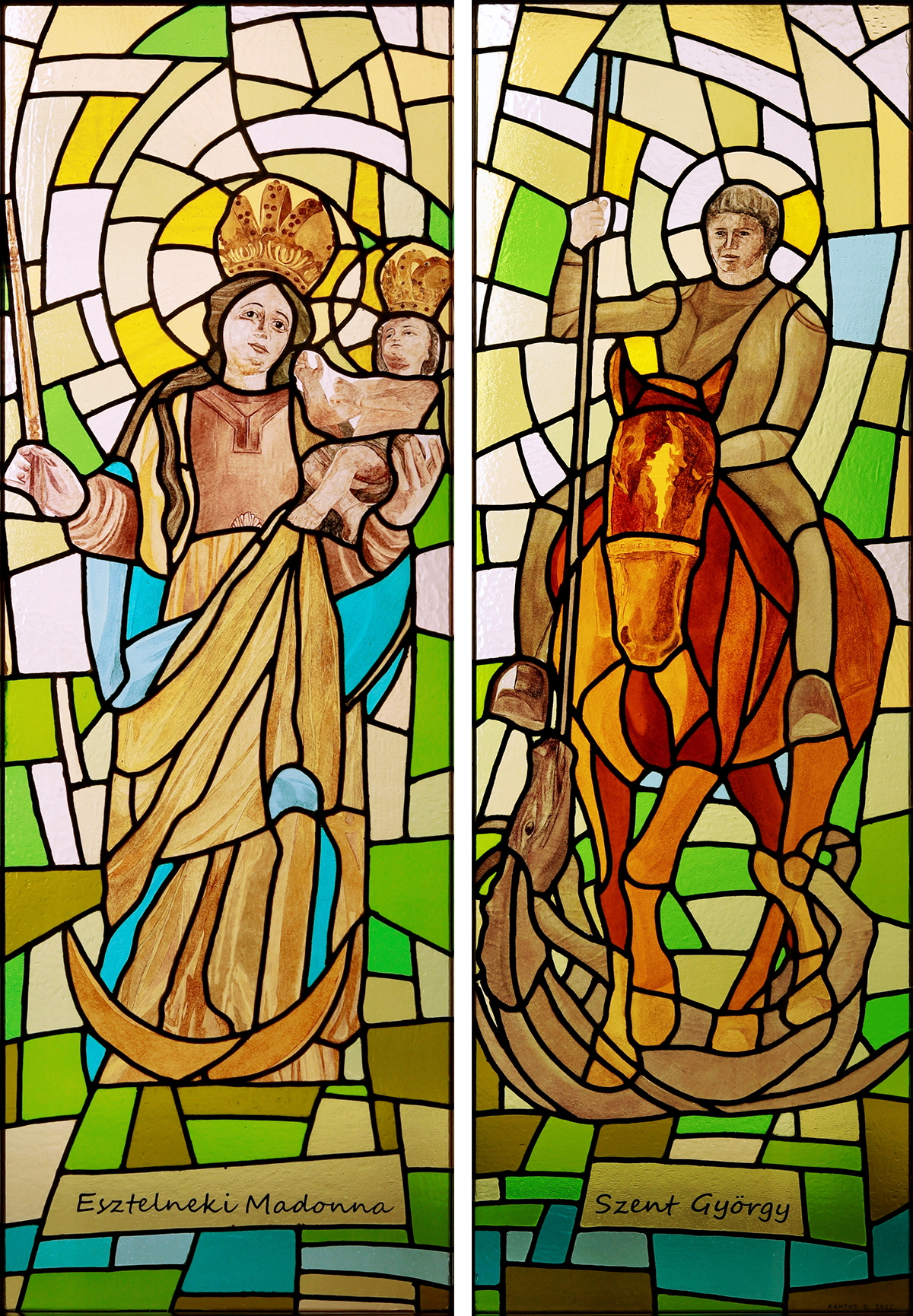 – Ez teljesen festői feladat, mert a tervezés határozza meg a színesüveg-ablak művészi színvonalát. Visszatérve ahhoz, hogy a Madonna-szobor formailag adott volt, amihez alkalmazkodni kellett ugyan, de a hátteret meg a környezetet én terveztem bele, és azt teljes egészében az én színvilágomból alakítottam ki. Más munkáknál meg a formát is az én elképzelésem szerint tudtam alakítani. A Szent György-kompozíciónál az áthatást is ábrázoltam, ahogy a sárkány átmegy a lovon. Itt már alkalmaztam a többi munkáimban használt többdimenziós térmegjelenítést, vagyis a formák, figurák átjárnak egymáson.
