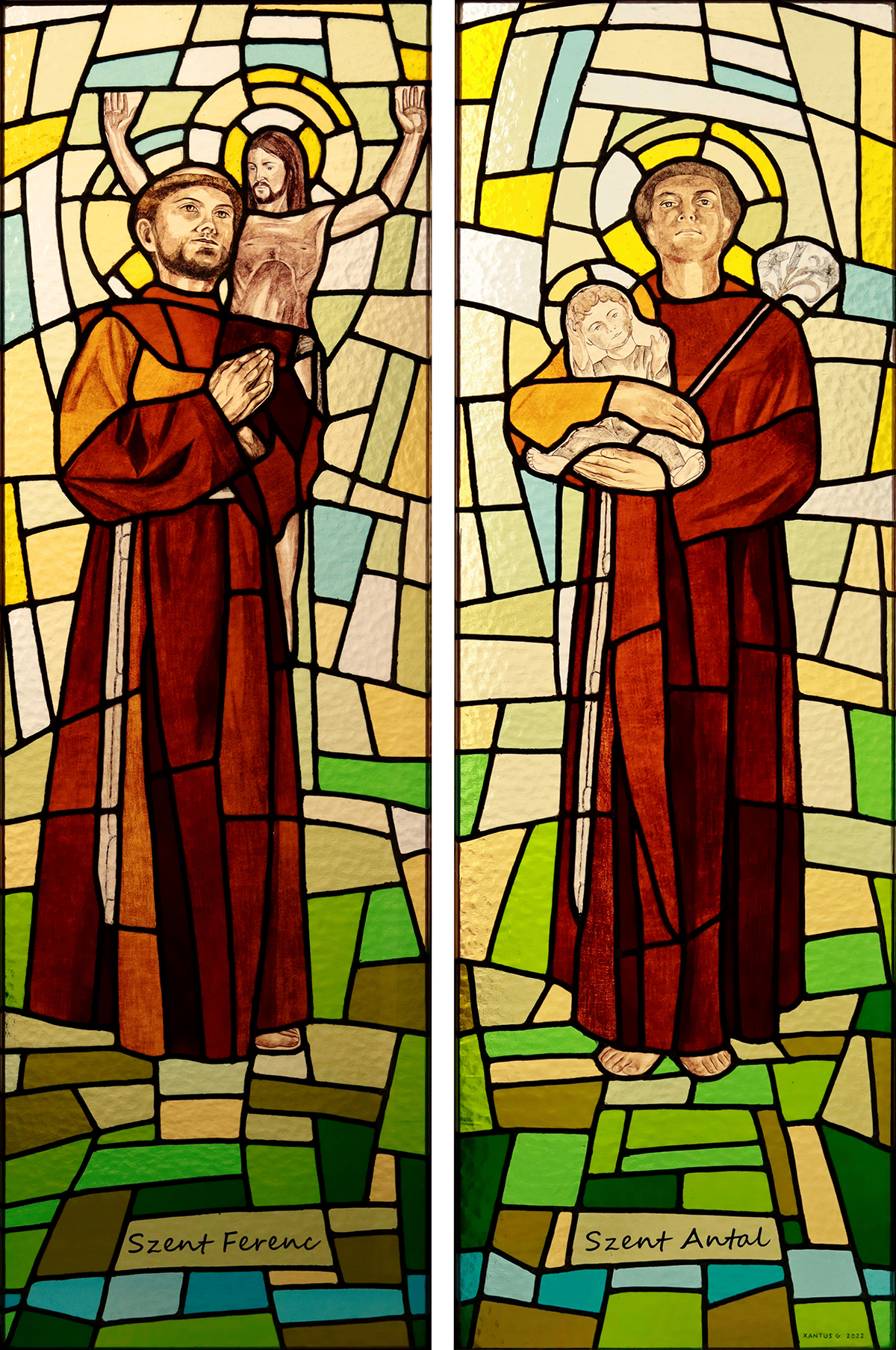 – Egy négy részből álló festett ablaküvegen dolgozom, amelynek elkészítésére az esztelneki ferences szerzetesek kértek fel. Azt kell tudni, hogy esztelneki ferences kolostornál a múlt század elején nagy tűz tört ki, és szinte teljes egészében leégett a kolostor és a templom, olyannyira, hogy a ferencesek átmenetileg el is kellett költözzenek. A mostani munka úgy kötődik ehhez az eseményhez, hogy volt az akkori templomban egy Madonna-szobor, amelyet Esztelneki Madonnaként ismernek. Ez a szobor pedig a leégés után is épen megmaradt. Amikor a ferencesek elköltöztek néhány évre, az épen maradt szobor Futásfalvára került és ott is maradt. Később a ferencesek visszaköltöztek, és kezdték visszaépítgetni a kolostort. A templom Bartók Albert atyának köszönhetően a nyolcvanas években kapta meg a mai formáját, amit 2016–2017 között Kakucs Szilveszter atya vezetésével sikerült teljesen felújítani. Most a kolostort újították fel, és abban alakítottak ki egy kápolnát, oda készíttették ezt a négy színes ablaküveget. Az egyikre az esztelneki Madonna szobrát ábrázoló kompozíció került. Mivel az esztelneki ferences templom védőszentje Szent György, az ő alakja került a másodikra, Szent Ferenc, a rend alapítója került a harmadikra, és kiemelkedő szentjük, Szent Antal, a negyedikre.