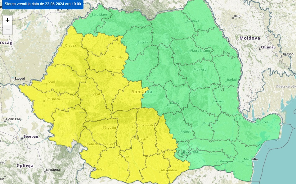 Esőre és viharokra figyelmeztető sárga jelzésű riasztást adott ki szerdán az Országos Meteorológiai Szolgálat (ANM) az ország 18 megyéjére. Hargita megyében is előfordulhatnak futó záporok csütörtök reggelig. Az előrejelzések szerint csütörtökön 10 óráig Nyugat-Erdélyben, a Bánságban, Körösvidéken, Olténiában és Havasalföldön a fokozott légköri instabilitás miatt villámlással kísért záporokra, megerősödő szélre, helyenként jégesőre is számítani lehet. A lehulló csapadék mennyisége meghaladhatja a 25-35 litert, helyenként a 40-50 litert négyzetméterenként – idézte a közleményt az Agerpres hírügynökség.