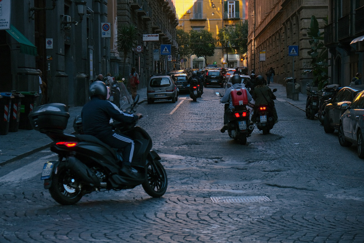 Aznap már nem megyünk az óvárosba, csak a környéket fedezzük fel. Nápoly a keskeny utak, a krumpliorrú kisautók és főleg a hangosan burrogó robogók városa. Mindenki motorozik. Gyermekarcú kamaszok, magassarkús, kiskosztümös hivatalnokok, görbe öregemberek rázkódnak ócska járgányokon.