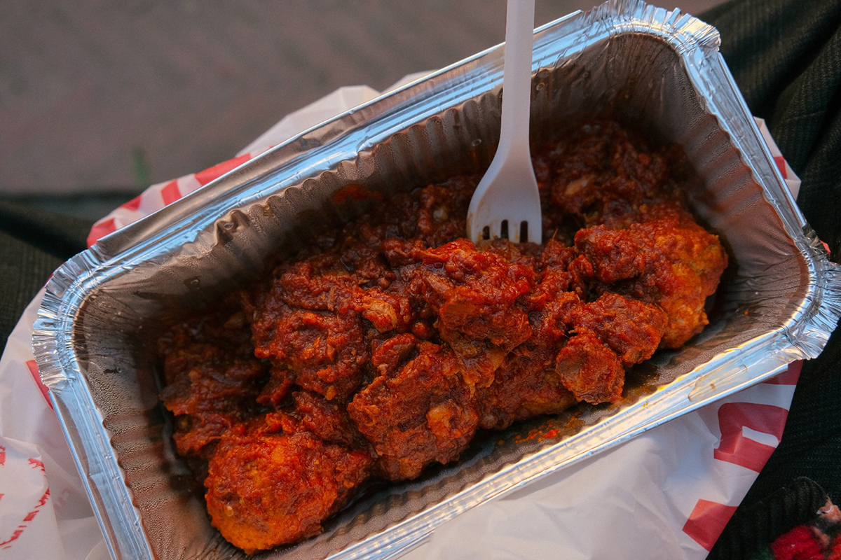 Egy kantinban vacsorázunk, az étkezde zsúfolt. Minden terasz tele. A nápolyiak kiülnek, hangoskodva élvezik a meleg ételt, az általuk jól ismert fogásokat rozoga műanyag asztalok előtt, műanyag tányéron, műanyag villákkal. A tálcákon parmezános padlizsán, marharagu, olívaolajas cukkini, kövér mozzarellák, termetes húsgolyók paradicsomszószban. Édesanyám pestós fusillit, én húsgolyót veszek, mindketten kipróbáljuk a padlizsánt is. Köretként ajánlják, de felét sem bírjuk megenni, három étkezésre elég ételt pakolnak fel nekünk.