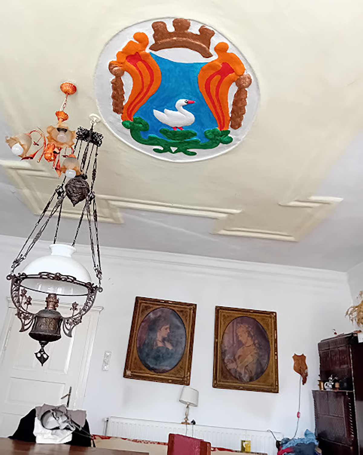 Az egykori ebédlőben járunk, nagy, tágas helyiség. A fejünk fölött az eredeti mennyezeti tartógerendák katonás rendben sorakoznak. Kiállták az idő próbáját, a mesterek nagyszerű munkát végeztek, igazi remekmű, ma is kedves a szemnek. Nézem, mi maradt még a múltból. A sarokban egy csipkés vasérc kályha, valamikor nemcsak dísze, de melegítője is volt a kúriának, ma emlék. Később megtudom, hogy volt ennél értékesebb is, de annak már új gazdája van. Öt szekrényt számolok a nagy teremben, mindenik más-más időszakból, az egyik nagyon réginek tűnik. A falon képek, de mindjárt megnyugtat a gazda, hogy nem eredetiek, hanem másolatok. A család festményeit elkobozták, soha nem adták vissza. A konyhán keresztül egy másik szobába megyünk, ahol a mennyezeten látható hattyús címerre hívja fel a figyelmemet, az eredeti Lukácsffy-címerben a hattyú kardot tart a szájában, úgy látszik, időközben valahol elhullatta, mert a mennyezetin hiányzik. De a címer is ékes bizonyítéka annak, hogy a Lukácsffy-kúriában járunk. Egy múlt századi függő petróleumlámpa szintén a régi időket igazolja. A Lukácsffyak címere, melyben a hattyú kardot tart a szájában, egy kicsit hasonló a Bedő-címerhez, ahol a hármas halmon egy repülni készülő galamb egy zöld ágat tart a csőrében. Pálmay József Udvarhely vármegye nemes családjai című könyvében azt írja, hogy „a Lukács és Lukácsffi család valamikor egy törzsből indultak ki. Mint primipilus nemesek éltek Bikafalván (régente Küküllőfalva), s mint ilyen, Lukács Balázs már az 1614. évi lustrális könyvbe fel is van véve. 1670-ben Apafi Mihálytól nyernek címeres nemeslevelet. Egyik ága, illetőleg Sámuel a Lukácsffi nevet veszi fel, mely nevet 1753. december 29-én Mária Terézia királynő is sanctional s a Nagyküküllőfalvi előnevet is adományozza, illetve annak eddigi használatát is engedélyezi.