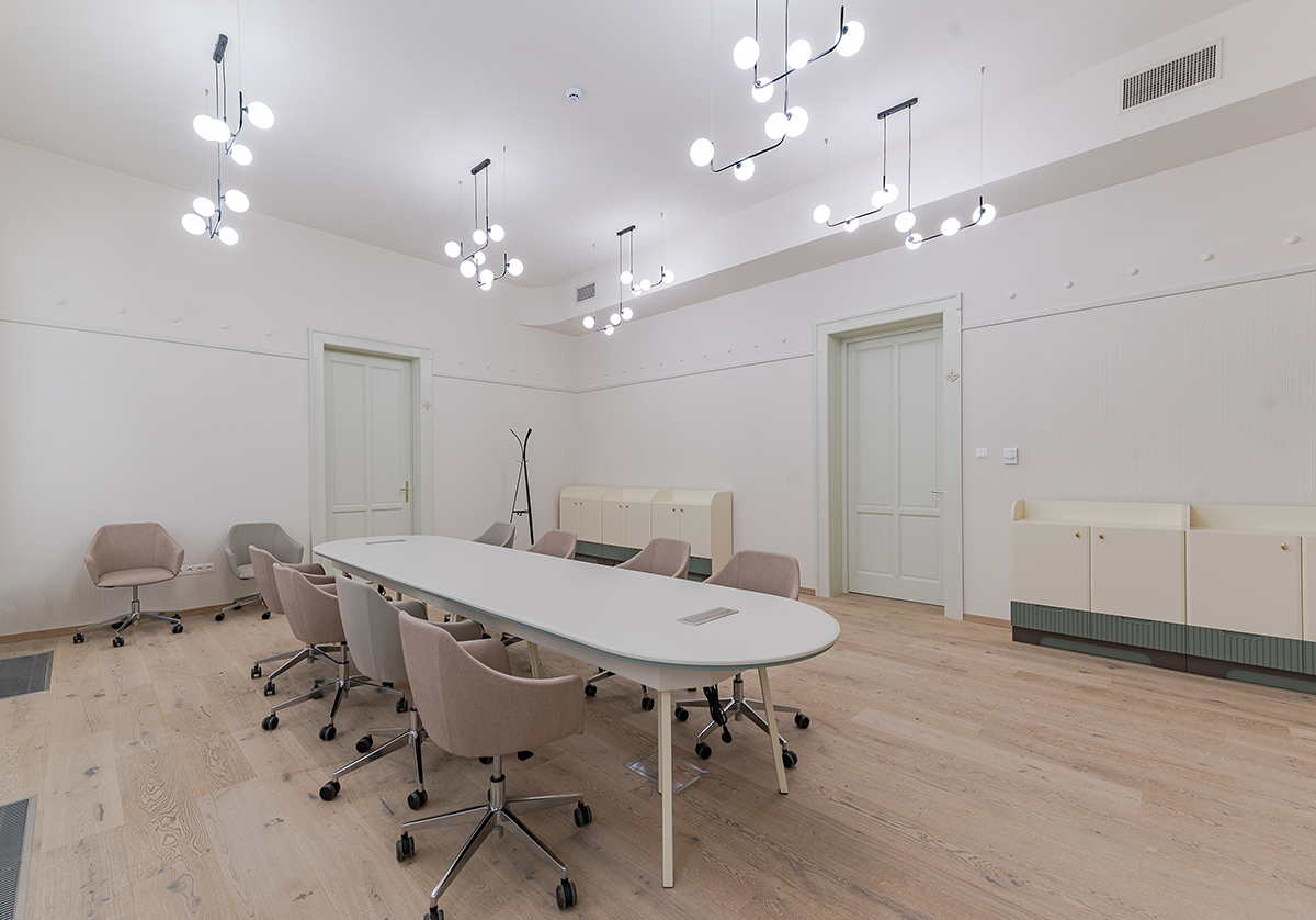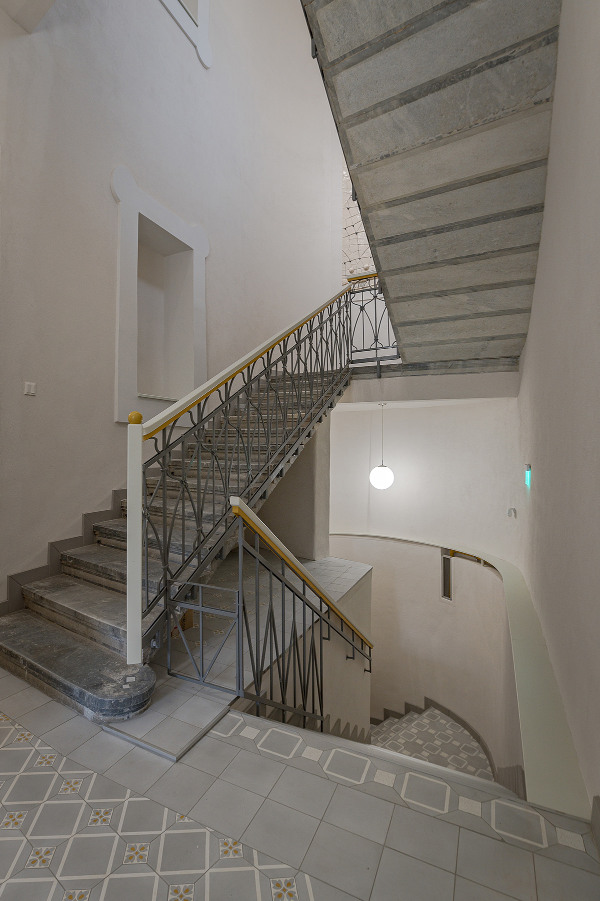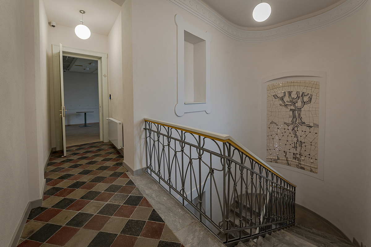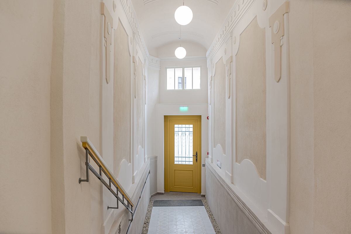 ‒ Az előterek, folyosók és irodák falainak és mennyezeteinek díszítése nagyon visszafogott és mai. Egyszerre alkalmazkodik a szecessziós miliőhöz és tükrözi, hogy kortárs beavatkozásról van szó. Ezek néha a mögöttük rejlő, mai épületekben nélkülözhetetlen gépészetet vagy a felújítás során alkalmazott szerkezeti megerősítéseket takarják
