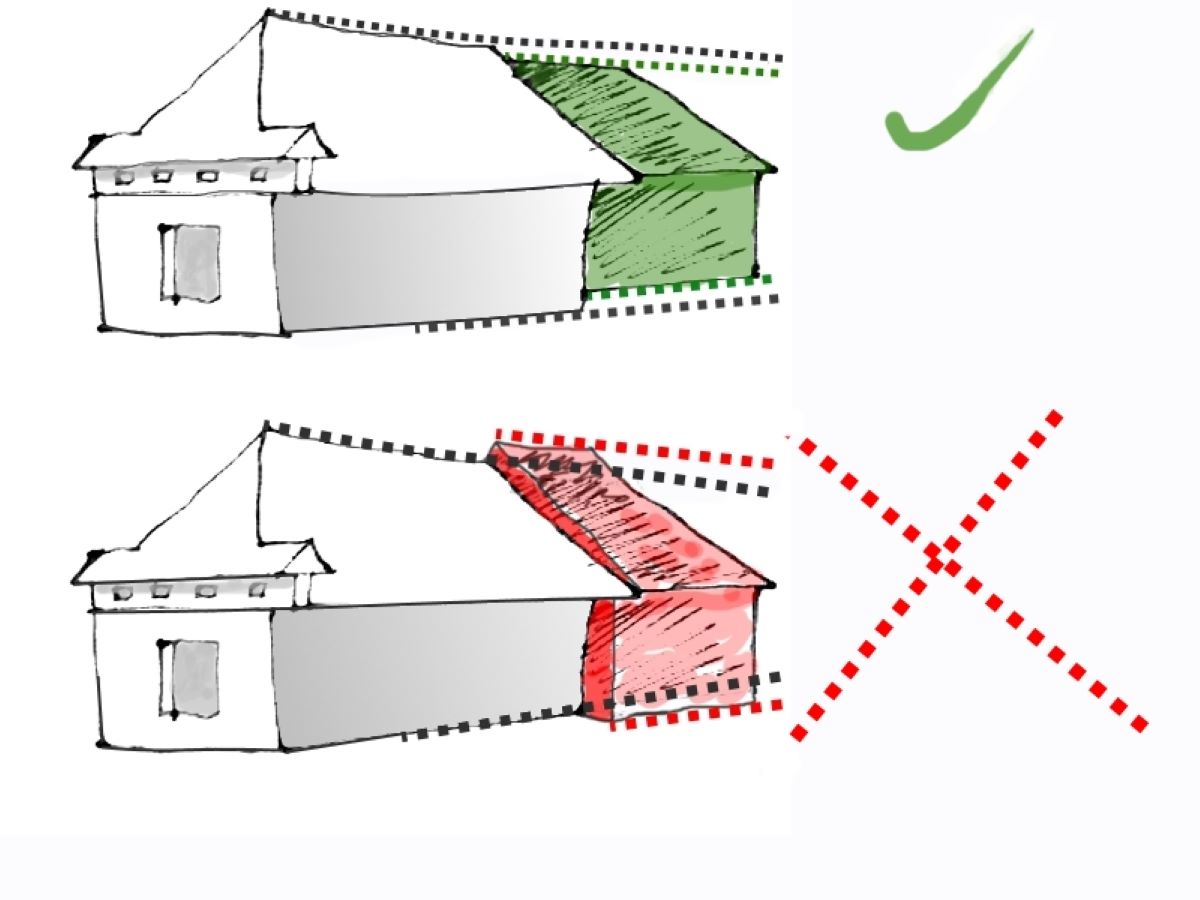 A még meglévő, földszintes kockaházak továbbgondolásánál járható út – ha az udvar és az urbanisztikai mutatók engedik –, ha a hagyományos parasztházakhoz hasonlóan megpróbáljuk hátrafelé bővíteni, megtartva földszintes épületnek őket. Ha ez a lehetőség nem járható vagy nem elégséges, akkor a tető játékos volumetriájára, olyan módon való tagolására kell törekedni, melynek révén a ház a lehető legjobban illeszkedik a falvak hagyományos arculatába.