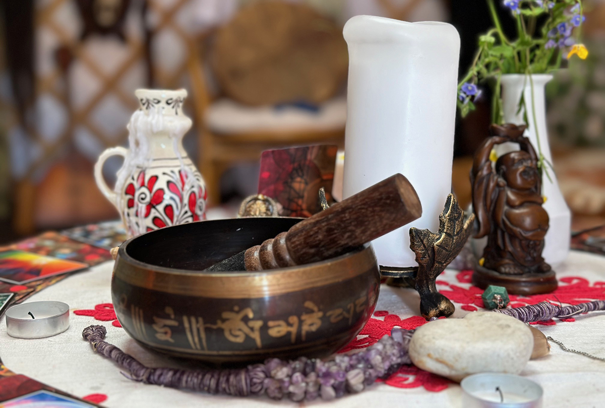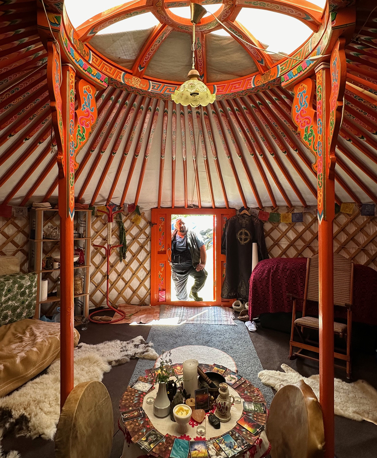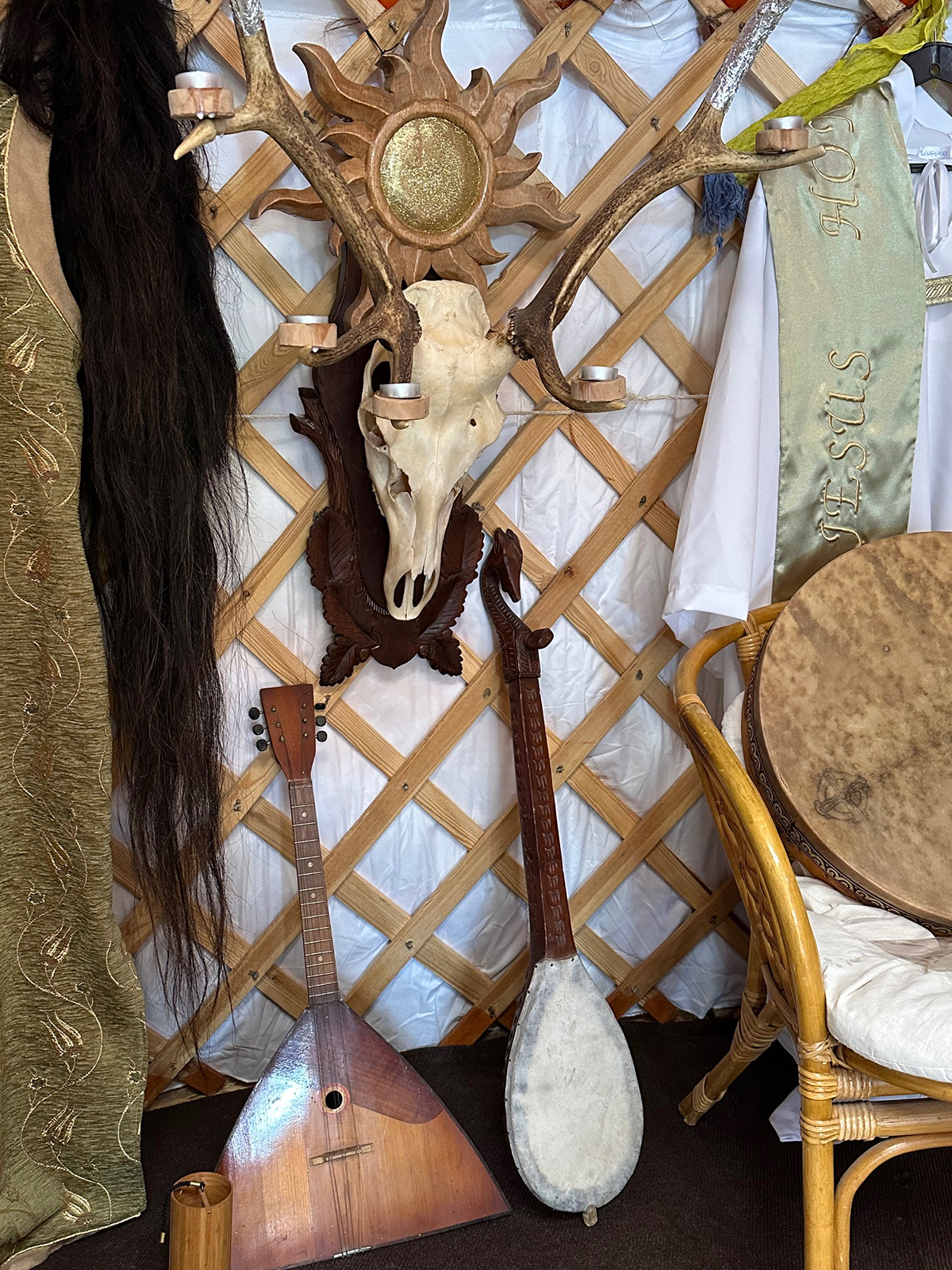 – A jurta Ázsiában a mai napig lakóházként szolgál, főleg a nomád életet folytatóknál, ahol fontos, hogy gyorsan tovább tudjanak állni abban az esetben, ha új legelőket keresnek. Ezek ugyanazok a jurták, csak mi nem folytatunk vándorló életmódot, ezért arra törekszünk, hogy jól szigeteljük, hisz itt másak az éghajlati viszonyok. Lehet itthon is benne élni, teljesen más érzés, mint a ház, hisz a jurtának spirituális energiája van. Van néhány szabály, amit figyelembe kell venni, például a tájolását: az ajtó kelet felé kell nézzen, vannak íratlan szabályok arra is, hogy hogyan közlekedjünk a jurtában, mindig balról jobbra, a középen álló istenes fák között sosem megyünk át, mert az a kapcsolat az ég és a föld között. A tündök felül van, nyitható, ott áramlik be az energia, és ott megy ki a füst, ha tüzelünk. Érdekes szimbólum a körbezárt, egyenlő szárú kereszt, amely akár a négy évszakot, a négy égtájat is szimbolizálhatja. Főleg a természetközeli népek ünnepeiket évszakokhoz, illetve a napfordulókhoz kötötték. Nyári időszakban oda helyezzük el az oltárt. Őseink oltárán egy hétagancsú szarvasfej volt, az én trófeámon is épp hét agancs volt, így ez került az oltárra – tudunk meg néhány információt a berendezésről.