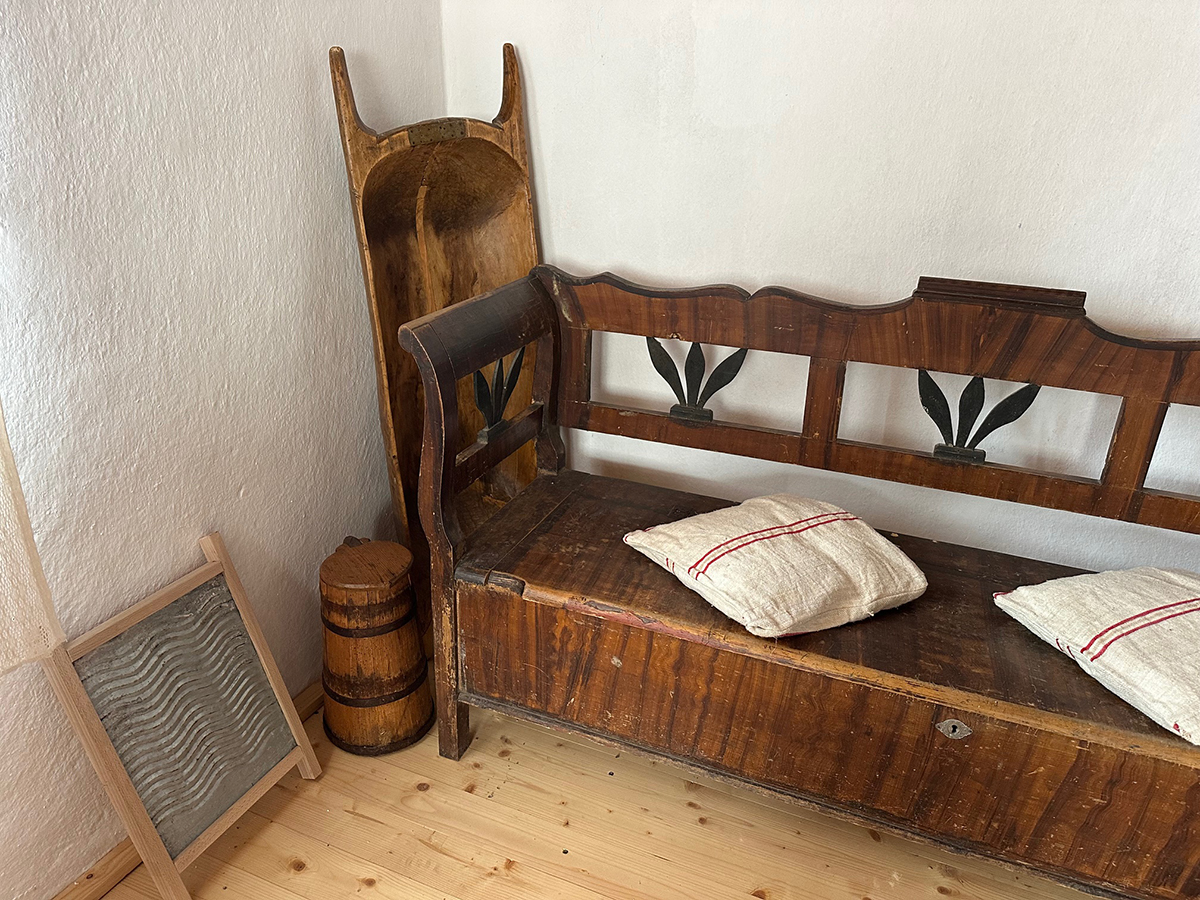A múlt egyik kézzelfogható bizonyítéka a tornácon lévő régi lisztesláda, amelyet a férj, Lurcza László újított fel. Minden famunka – a csűr, a bejárati kapu, a zsalugáterek, a lépcsők – az ő keze munkáját dicsérik. 1972-ben végezte a szakiskolát Udvarhelyen a Petőfi utcában, majd egy brassói asztalosműhelyben gyakorlatozott, ahonnan aztán Négyfaluba helyezték ki a katonaságig, 1974-ig. Katonaság után az udvarhelyi bútorgyárban dolgozott asztalosként, a mesteriskola elvégzése után mesterként folytatta. Nyugdíjazása után öt éven át egy patakfalvi osztrák-román cégnek dolgozott munkavezetőként. A házban és a ház körül minden famunkát ő készített, ezt adva hozzá az örökséghez.