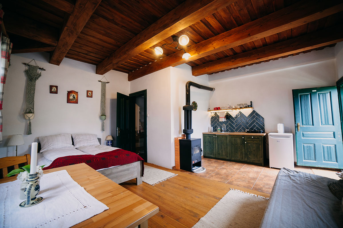 A szoba-konyhás tornácos parasztházat, amelyet ma otthonukként használnak, minimális beavatkozással oly módon újították, alakították, hogy mindamellett, hogy kényelmüket szolgálja, megőrizzék annak parasztház jellegét. A kis ház külön bejáratú két helyiségét – a nappalit és a szobát – fűtő agyagkályha már adva volt, ők a fürdőszobát alakították ki, bevezették a hálózati vizet, a tornác korhadt léceit kicserélték saját készítésű lécekre.