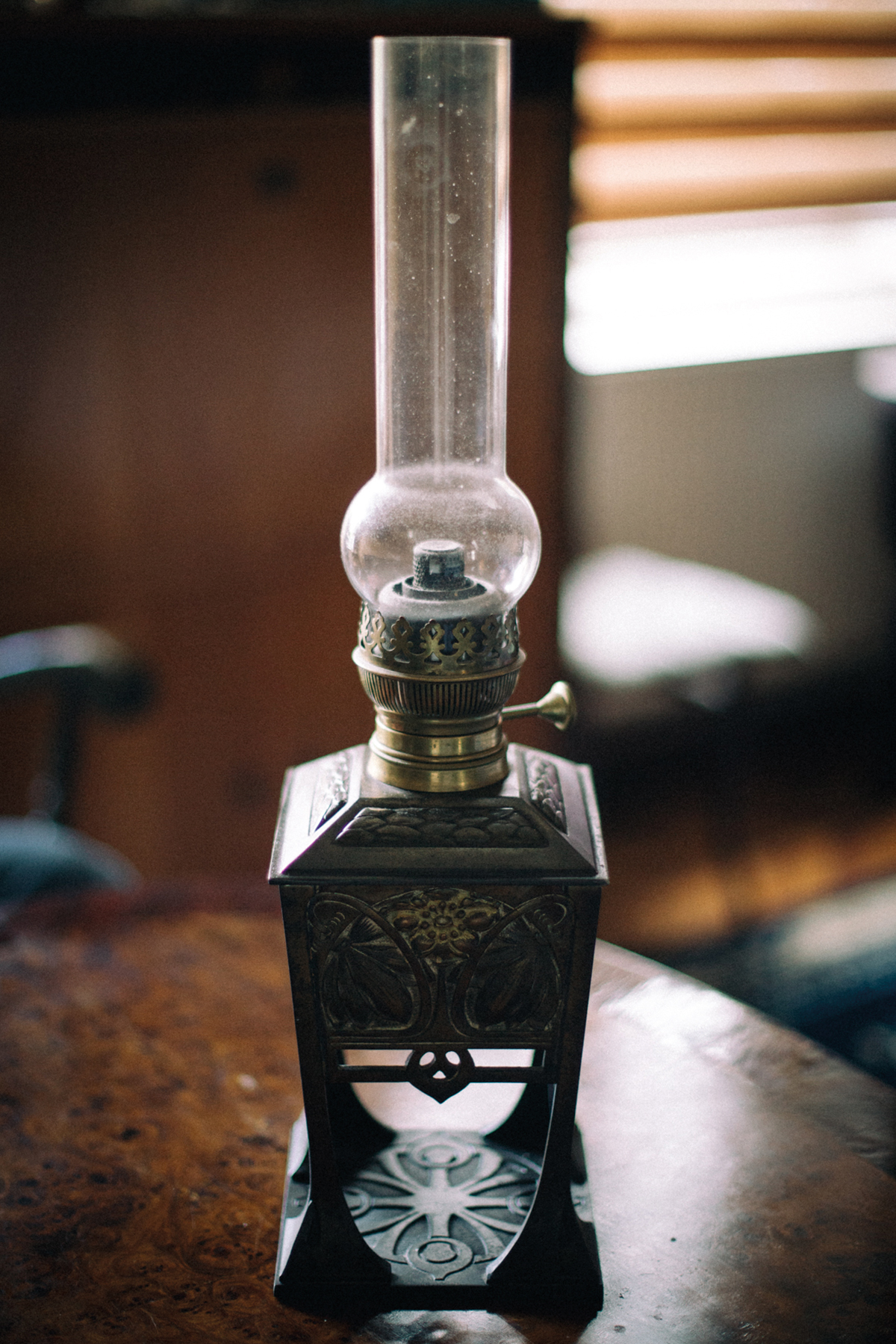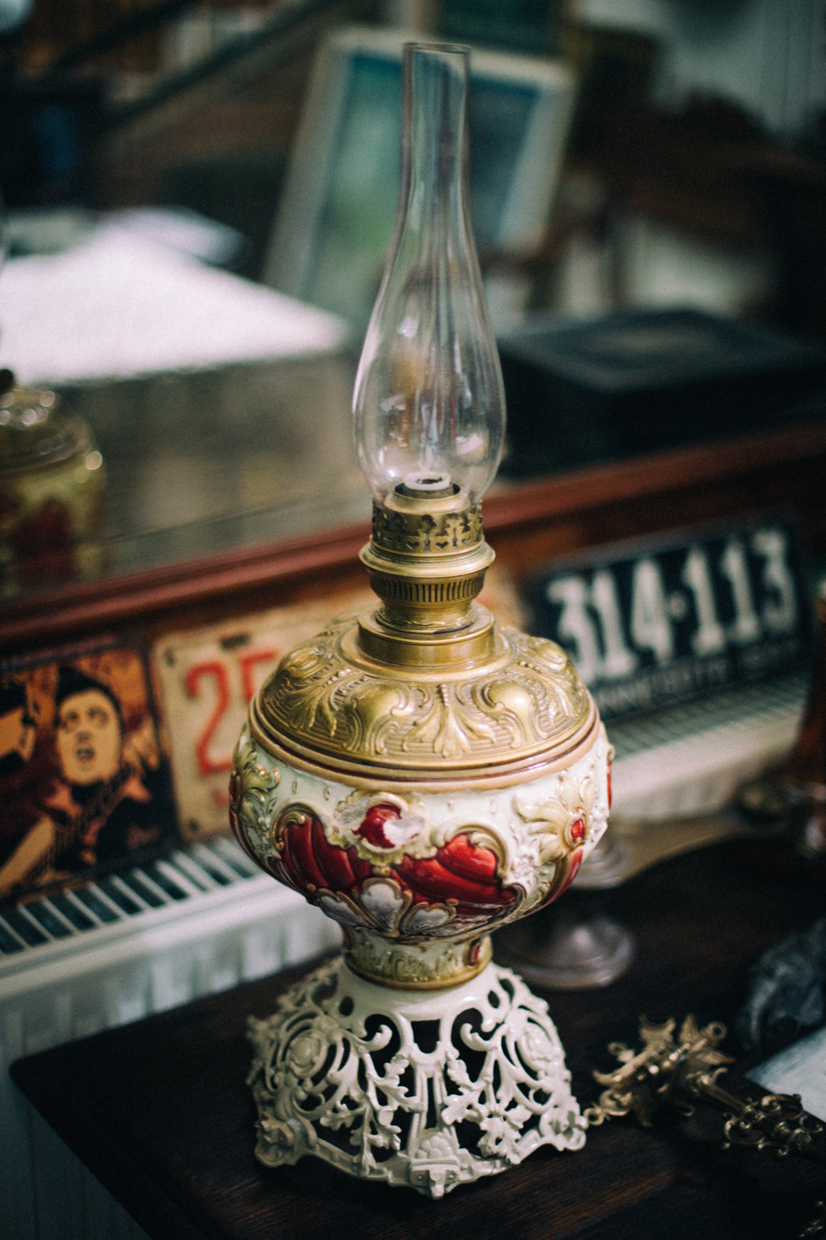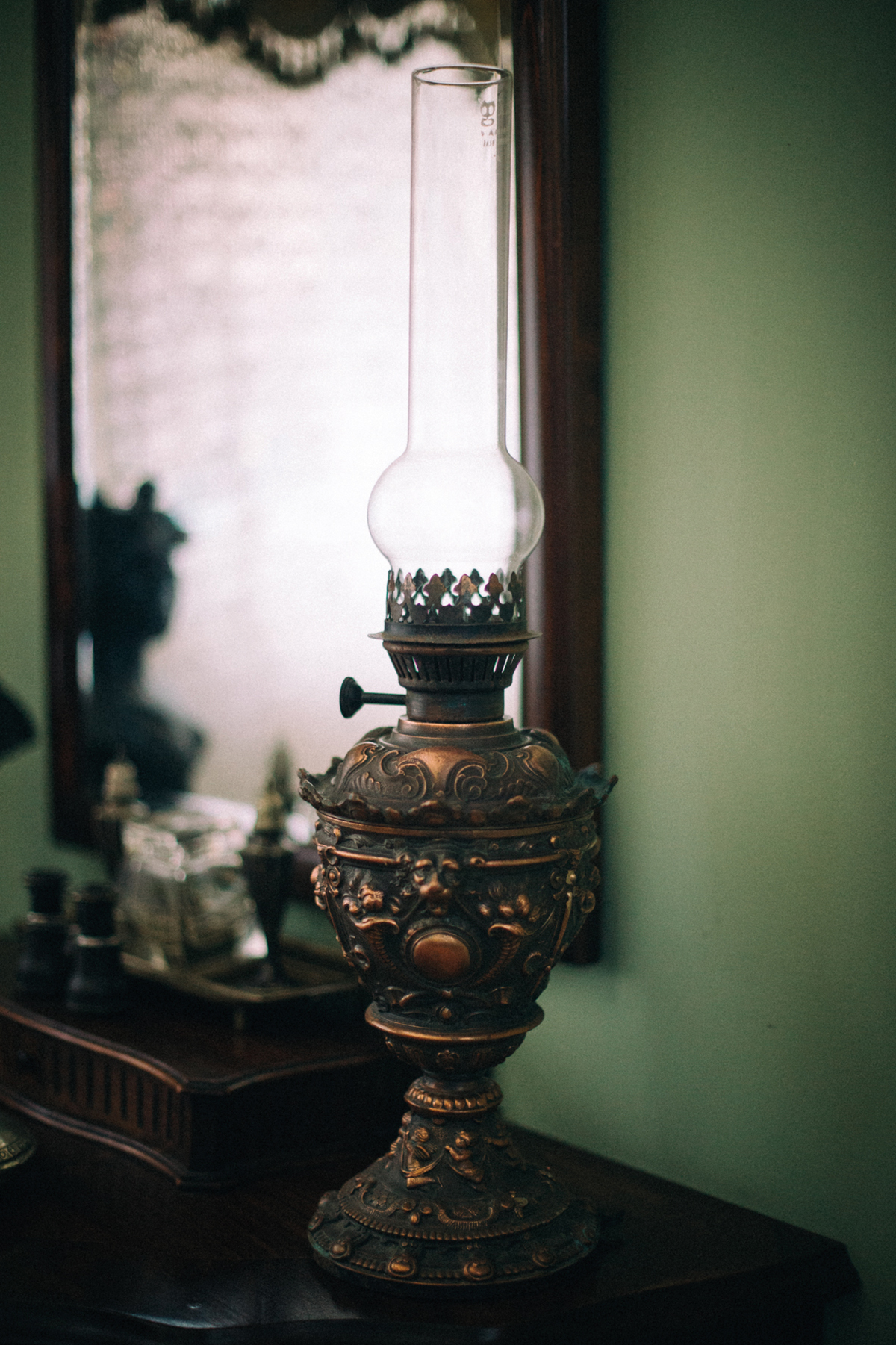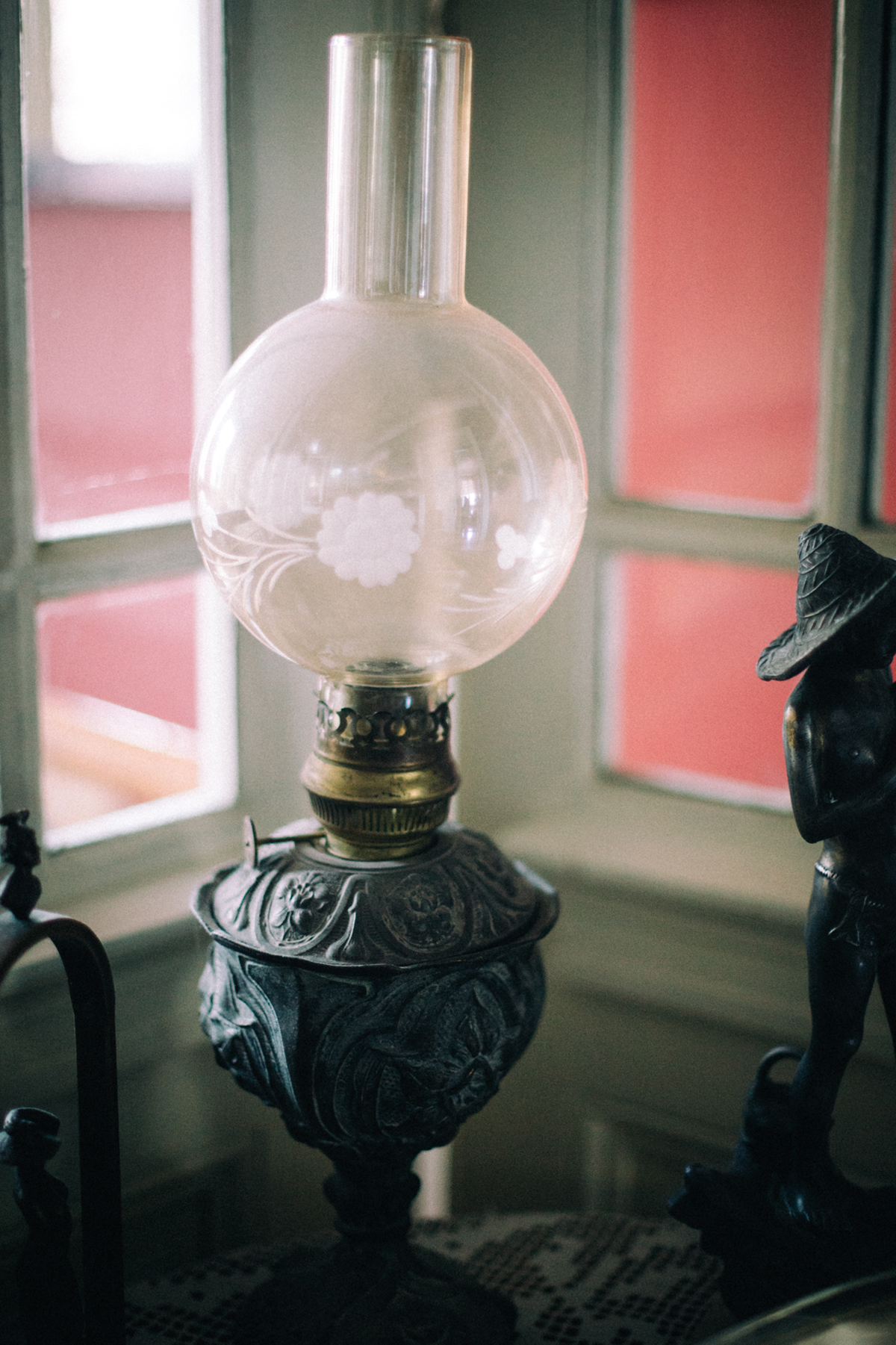Az antik dohányzóasztalon áll ez a gyönyörű motívumokkal díszített, ónból és rézből készült lámpa, úgynevezett spiáter. Tekintélyes magassága és súlya ellenére kecsesen ható dísztárgy. Pontos kora ismeretlen, mint az oly gyakori a különböző ócskapiacokon, vásárokon beszerzett portékánál.
