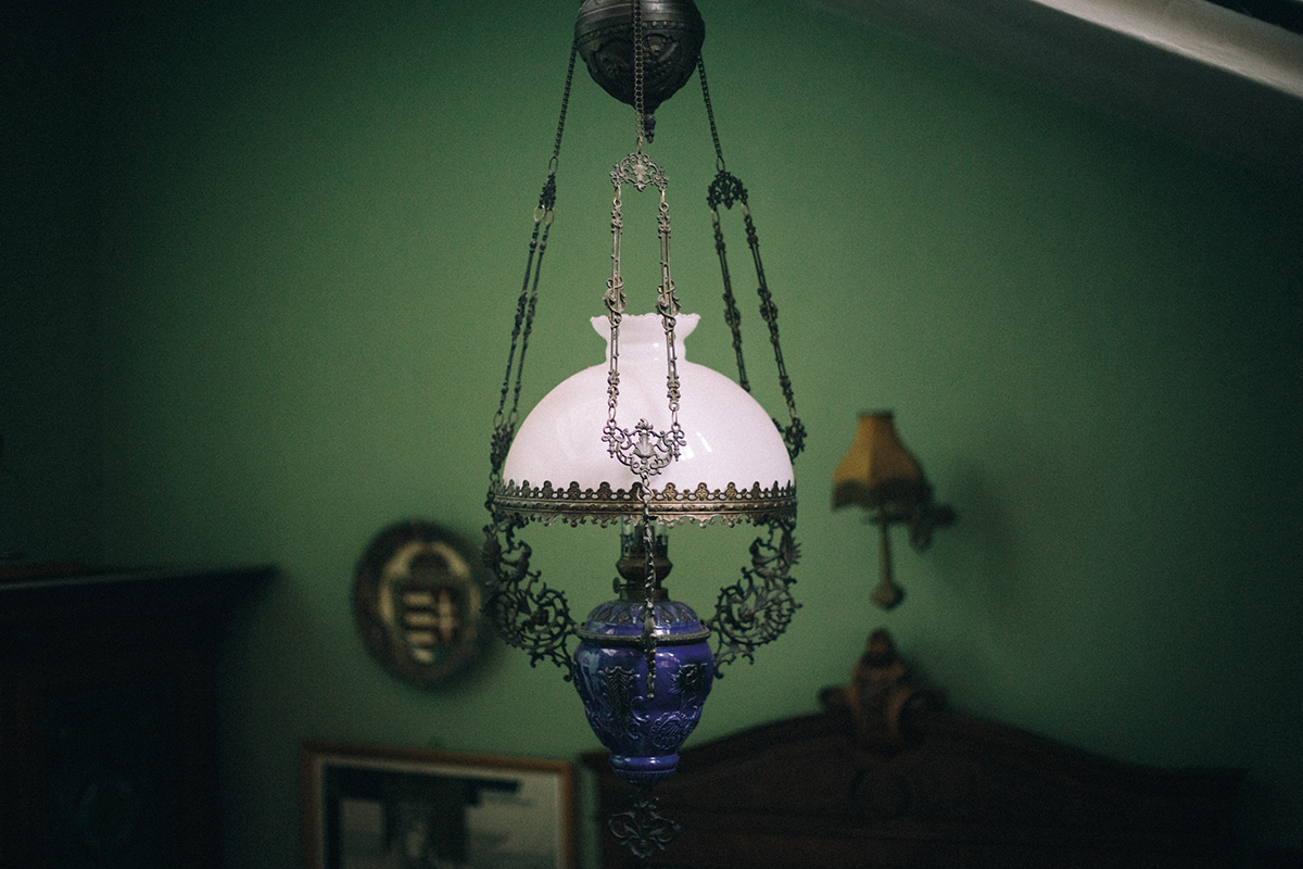 Izgalmasan mutat a királykék függőlámpa a méregzöld fal előtt. Termetes méreténél fogva kizárólag nagy terekben érvényesül jól. Olajjal működik, a mai napig kifogástalanul.