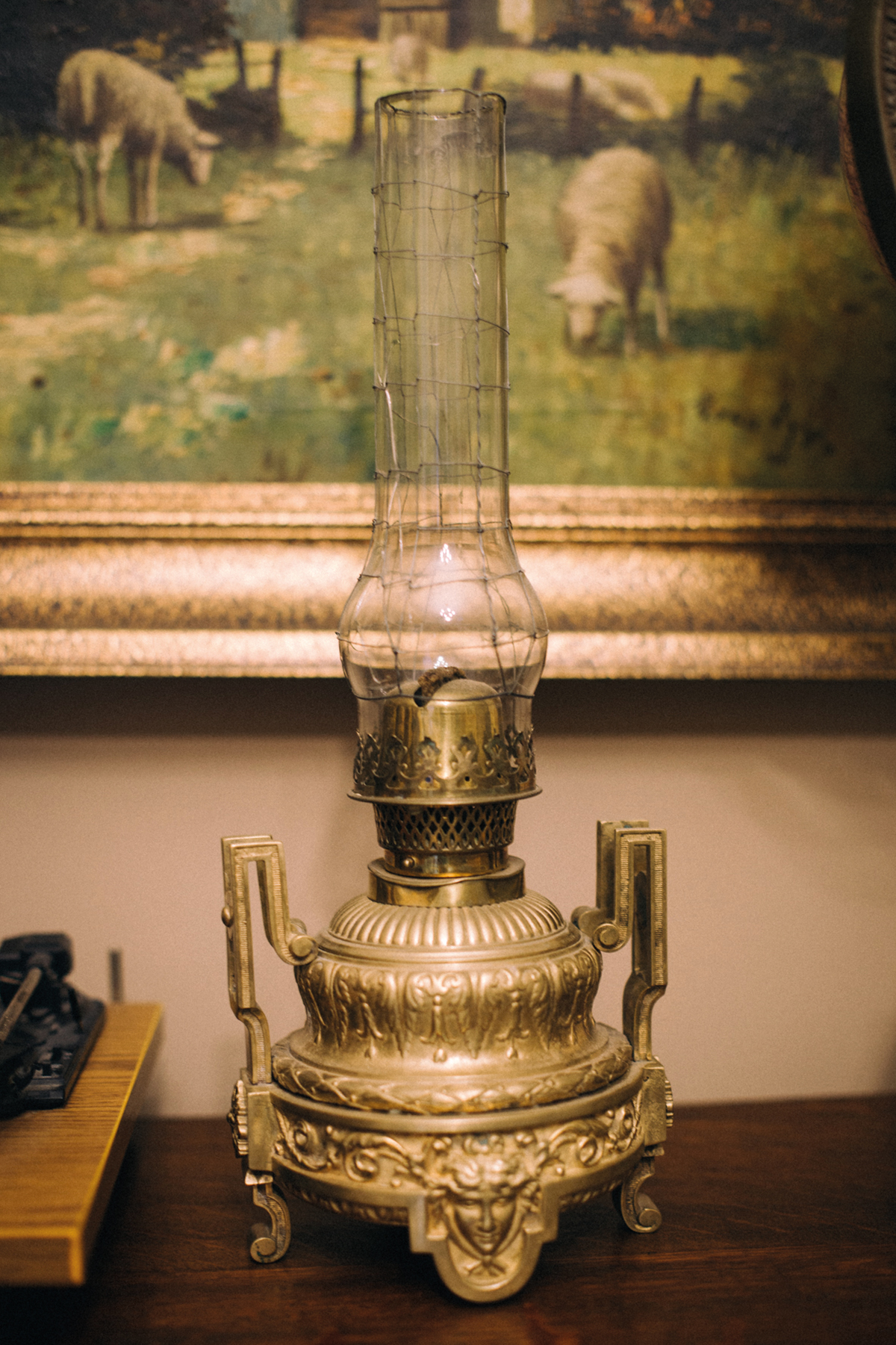 A lépcsőfordulóban található konzolasztalra irányítja a tekintetet ez a vörösrézből készült, domborművekkel díszített petróleumlámpa. Oroszlánfejet és pajzsot figyelhetünk meg rajta, talapzatán kis angyalok járják körtáncukat. A készítő kis párkányt hozott létre, ami nem csupán díszes, de praktikus is, ha az ember a meggyújtást követően szeretné lerakni az elhasznált gyufaszálat.