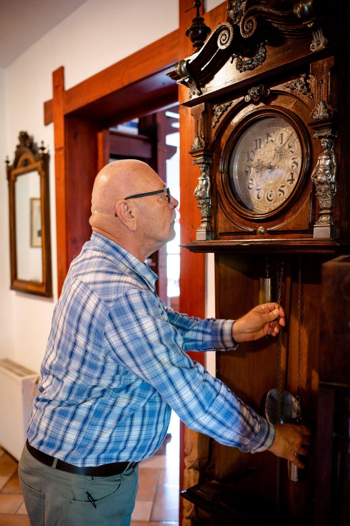 – Minden két-három napban felhúzom, és minden három-négy hétben késik egypár percet, azt is igazítom. Nagyon szép darab, ezt csak én kezelem – mondja a házigazda, és ellenőrzi, jól mutatja-e az időt.