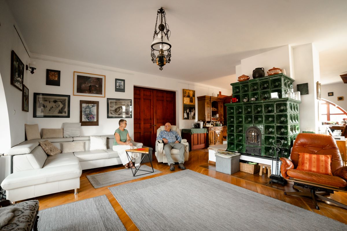 A nappali-étkező robusztus asztala mellett ülünk, mögöttem a teret elválasztó és fűtő csempekályha, mellette egy régi varrógép pihen.