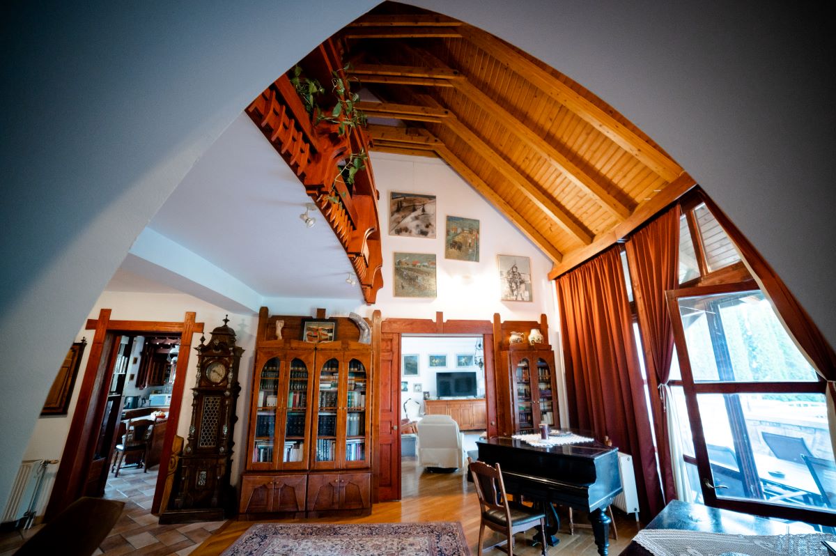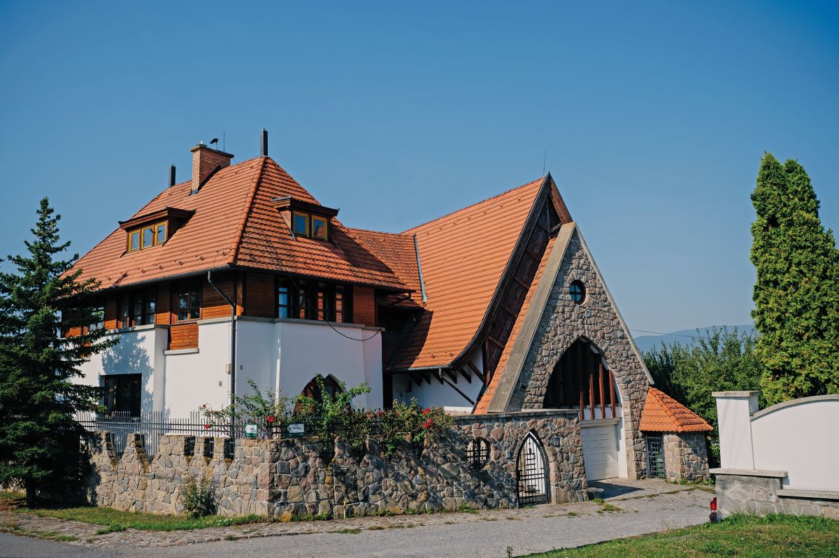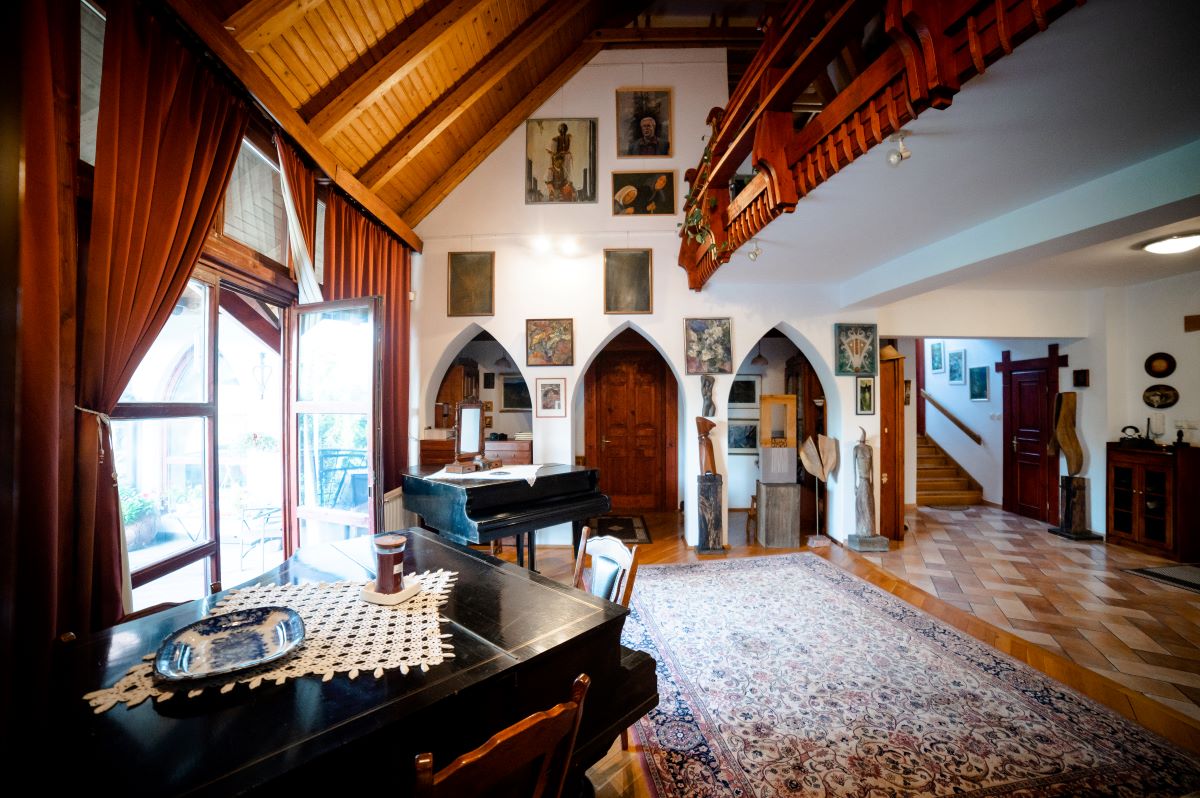 Nehéz szavakba önteni a Szász házaspár otthonának különleges atmoszféráját. A kőburkolatos oromfalak, galériák, a fával burkolt emeleti rész, a rusztikus kőfalak, a minden részletében aprólékosan kidolgozott elemek az alkotói kreativitás lenyomatai. Izgalmas világ sejlik fel a kőfalak mögött, s bár a ház külső megjelenésre ugyan grandiózus, belső terei otthonosságot sugároznak.